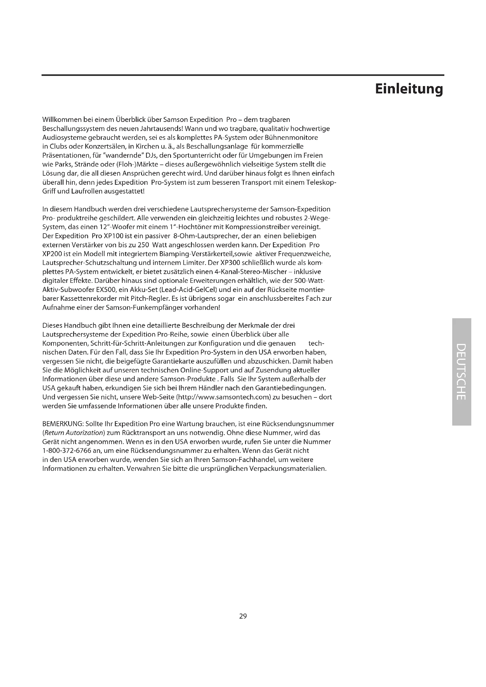 nischen Daten. Für den Fall, dass Sie Ihr Expedition Pro-System in den USA erworben haben, vergessen Sie nicht, die beigefügte Garantiekarte auszufüllen und abzuschicken. Damit haben Sie die Möglichkeit auf unseren technischen Online-Support und auf Zusendung aktueller Informationen über diese und andere Samson-Produkte . Falls Sie Ihr System außerhalb der USA gekauft haben, erkundigen Sie sich bei Ihrem Händler nach den Garantiebedingungen. Und vergessen Sie nicht, unsere Web-Seite (http://www.samsontech.com) zu besuchen – dort werden Sie umfassende Informationen über alle unsere Produkte finden. BEMERKUNG: Sollte Ihr Expedition Pro eine Wartung brauchen, ist eine Rücksendungsnummer (Return Autorization) zum Rücktransport an uns notwendig. Ohne diese Nummer, wird das Gerät nicht angenommen. Wenn es in den USA erworben wurde, rufen Sie unter die Nummer 1-800-372-6766 an, um eine Rücksendungsnummer zu erhalten. Wenn das Gerät nicht in den USA erworben wurde, wenden Sie sich an Ihren Samson-Fachhandel, um weitere Informationen zu erhalten. Verwahren Sie bitte die ursprünglichen Verpackungsmaterialien. DEUTSCHE 29Produktmerkmale des Expedition Pro-Systems Die Samson-Expedition Pro-Lautsprechersysteme sind auf dem neuesten Stand der Technik. So verleihen sie professionellen Audio-Produkten eine noch nicht dagewe