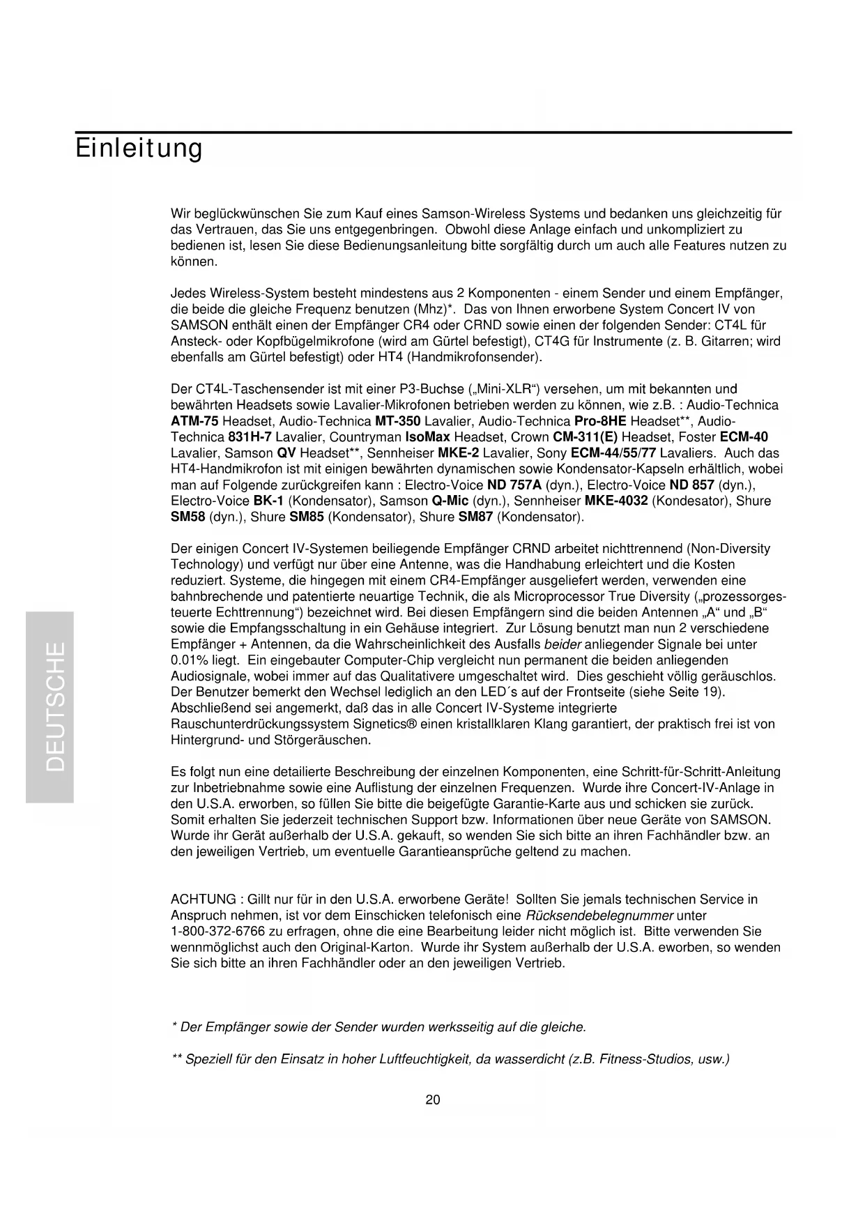 FRANCAIS20 DEUTSCHE Einleitung Wir beglückwünschen Sie zum Kauf eines Samson-Wireless Systems und bedanken uns gleichzeitig für das Vertrauen, das Sie uns entgegenbringen. Obwohl diese Anlage einfach und unkompliziert zu bedienen ist, lesen Sie diese Bedienungsanleitung bitte sorgfältig durch um auch alle Features nutzen zu können. Jedes Wireless-System besteht mindestens aus 2 Komponenten - einem Sender und einem Empfänger, die beide die gleiche Frequenz benutzen (Mhz)*. Das von Ihnen erworbene System Concert IV von SAMSON enthält einen der Empfänger CR4 oder CRND sowie einen der folgenden Sender: CT4L für Ansteck- oder Kopfbügelmikrofone (wird am Gürtel befestigt), CT4G für Instrumente (z. B. Gitarren; wird ebenfalls am Gürtel befestigt) oder HT4 (Handmikrofonsender). Der CT4L-Taschensender ist mit einer P3-Buchse („Mini-XLR“) versehen, um mit bekannten und bewährten Headsets sowie Lavalier-Mikrofonen betrieben werden zu können, wie z.B. : Audio-Technica ATM-75 Headset, Audio-Technica MT-350 Lavalier, Audio-Technica Pro-8HE Headset**, Audio- Technica 831H-7 Lavalier, Countryman IsoMax Headset, Crown CM-311(E) Headset, Foster ECM-40 Lavalier, Samson QV Headset**, Sennheiser MKE-2 Lavalier, Sony ECM-44/55/77 Lavaliers. Auch das HT4-Handmikrofon ist mit einigen bewährten dynamischen sowie Kondensator-Kapseln erhältlich, wobei man auf Folgende zurückgreifen kann : Electro-Voice ND 757A (dyn.), Electro-Voice ND 857 (dyn.), Electro-Voice BK-1 (Kondensator), Samson Q-Mic (dyn.), Sennheiser MKE-4032 (Kondesator), Shure SM58 (dyn.), Shure SM85 (Kondensator), Shure SM87 (Kondensator). Der einigen Concert IV-Systemen beiliegende Empfänger CRND arbeitet nichttrennend (Non-Diversity Technology) und verfügt nur über eine Antenne, was die Handhabung erleichtert und die Kosten reduziert. Systeme, die hingegen mit einem CR4-Empfänger ausgeliefert werden, verwenden eine bahnbrechende und patentierte neuartige Technik, die als Microprocessor True Diversity („prozessorges- teuerte Echttrennung“) bezeichnet wird. Bei diesen Empfängern sind die beiden Antennen „A“ und „B“ sowie die Empfangsschaltung in ein Gehäuse integriert. Zur Lösung benutzt man nun 2 verschiedene Empfänger + Antennen, da die Wahrscheinlichkeit des Ausfalls beider anliegender Signale bei unter 0.01% liegt. Ein eingebauter Computer-Chip vergleicht nun permanent die beiden anliegenden Audiosignale, wobei immer auf das Qualitativere umgeschaltet wird. Dies geschieht völlig geräuschlos. Der Benutzer bemerkt den Wechsel lediglich an den LED´s auf der Frontseite (siehe Seite 19). Abschließend sei angemerkt, daß das in alle Concert IV-Systeme integrierte Rauschunterdrückungssystem Signetics® einen kristallklaren Klang garantiert, der praktisch frei ist von Hintergrund- und Störgeräuschen. Es folgt nun eine detailierte Beschreibung der einzelnen Komponenten, eine Schritt-für-Schritt-Anleitung zur Inbetriebnahme sowie eine Auflistung der einzelnen Frequenzen. Wurde ihre Concert-IV-Anlage in den U.S.A. erworben, so füllen Sie bitte die beigefügte Garantie-Karte aus und schicken sie zurück. Somit erhalten Sie jederzeit technischen Support bzw. Informationen über neue Geräte von SAMSON. Wurde ihr Gerät außerhalb der U.S.A. gekauft, so wenden Sie sich bitte an ihren Fachhändler bzw. an den jeweiligen Vertrieb, um eventuelle Garantieansprüche geltend zu machen. ACHTUNG : Gillt nur für in den U.S.A. erworbene Geräte! Sollten Sie jemals technischen Service in Anspruch nehmen, ist vor dem Einschicken telefonisch eine Rücksendebelegnummer unter 1-800-372-6766 zu erfragen, ohne die eine Bearbeitung leider nicht möglich ist. Bitte verwenden Sie wennmöglichst auch den Original-Karton. Wurde ihr System außerhalb der U.S.A. eworben, so wenden Sie sich bitte an ihren Fachhändler oder an den jeweiligen Vertrieb.