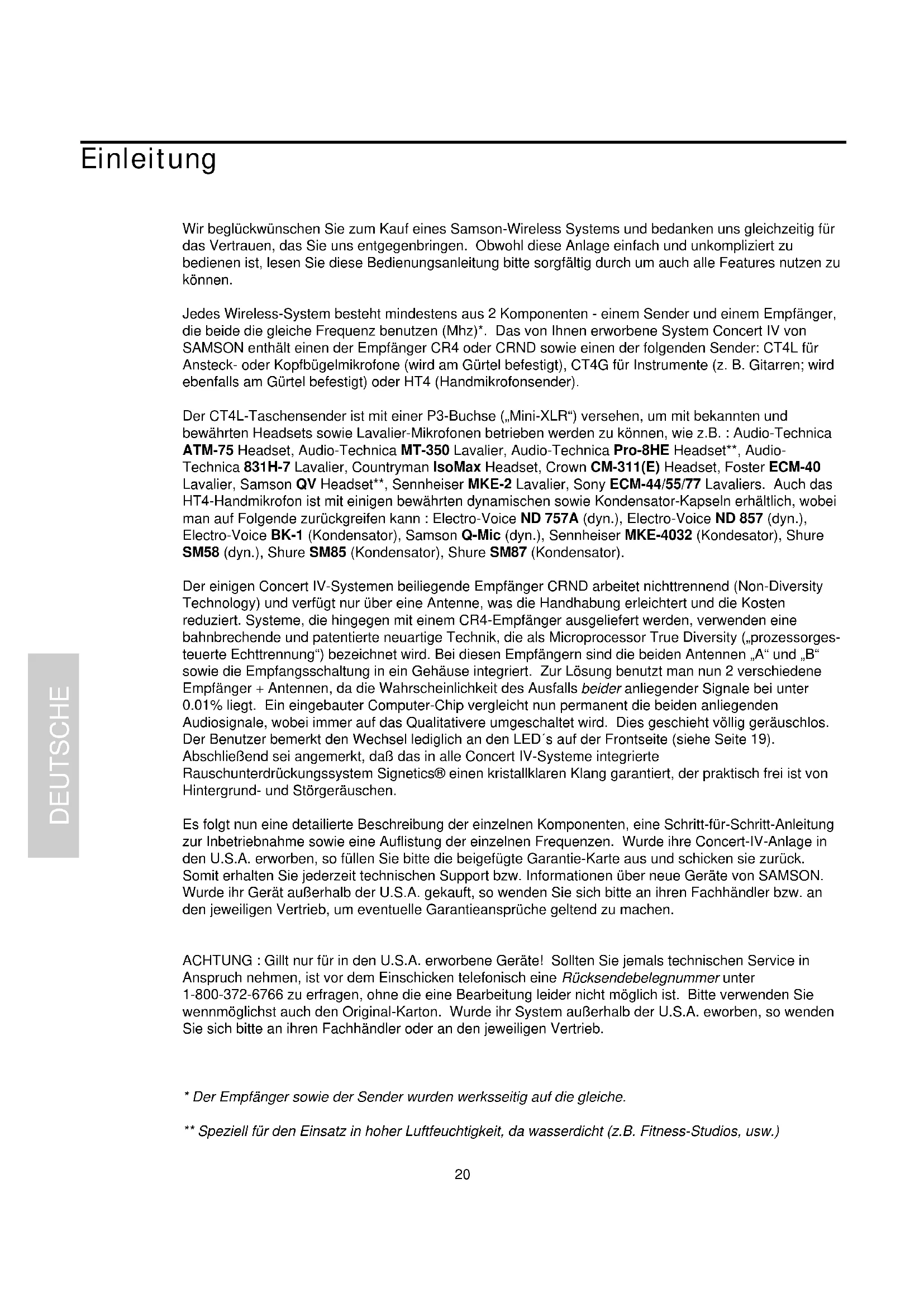 Es folgt nun eine detailierte Beschreibung der einzelnen Komponenten, eine Schritt-fur-Schritt-Anleitung zur Inbetriebnahme sowie eine Auflistung der einzelnen Frenzenen. Wurde ihre Concert-IV-Anlage in den U.S.A. erworben, so fullen Sieitte die beigeufige Garantie-Karte aus und schicken sie zurück. Somit erhalten Sie jederzeit technischen Support bzw. Informationen über neue Geräte von SAMSON. Wurde ihr Gerät außerhalb der U.S.A. gekauft, so wenden Sie sichitte an ihren Fachhändler bzw. an den jeweiligen Vertrieb, um eventuelle Garantieansprüche geltend zu machen.