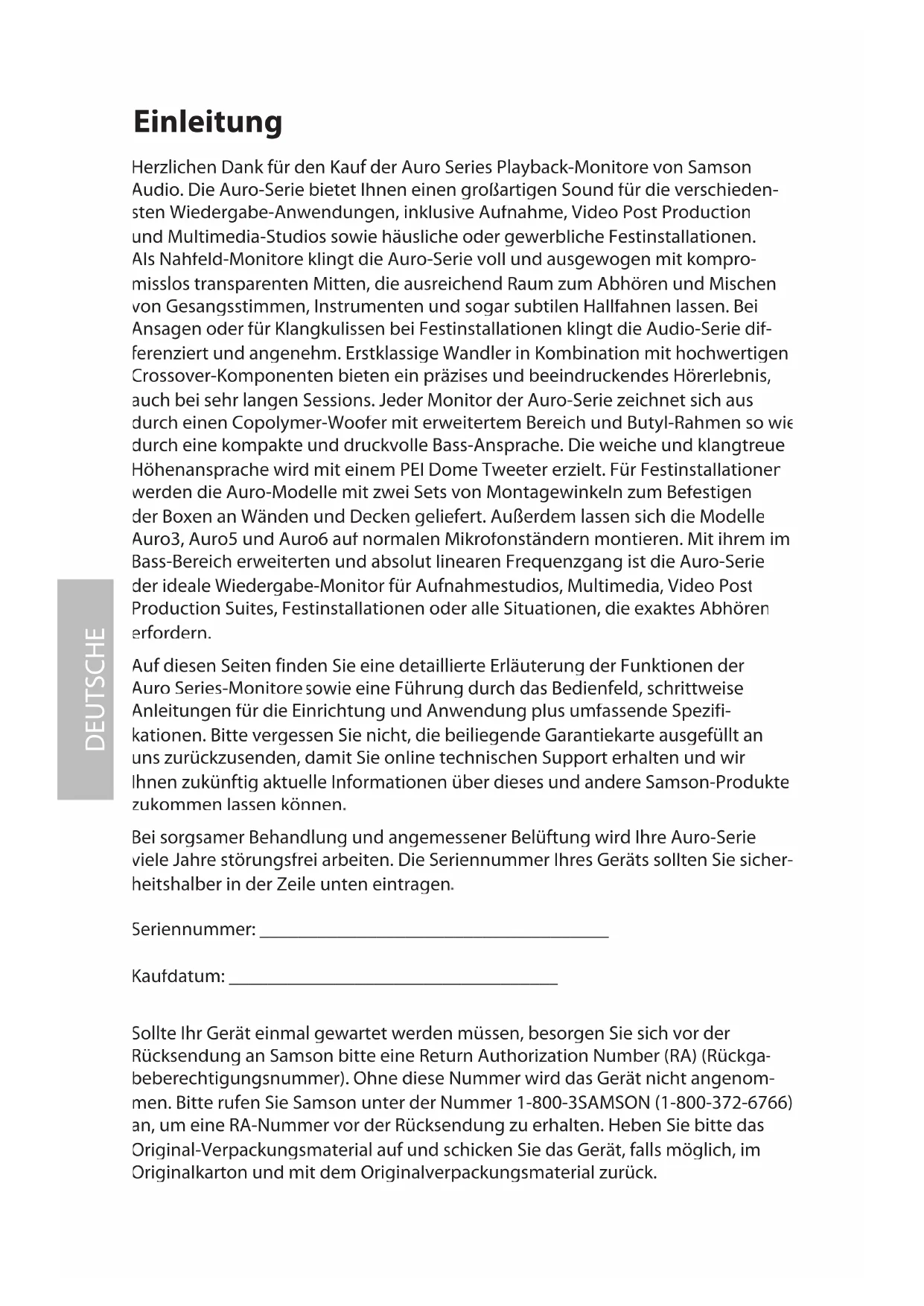 Seriennummer: ____________________________________ Kaufdatum: __________________________________ Sollte Ihr Gerät einmal gewartet werden müssen, besorgen Sie sich vor der Rücksendung an Samson bitte eine Return Authorization Number (RA) (Rückga- beberechtigungsnummer). Ohne diese Nummer wird das Gerät nicht angenom- men. Bitte rufen Sie Samson unter der Nummer 1-800-3SAMSON (1-800-372-6766) an, um eine RA-Nummer vor der Rücksendung zu erhalten. Heben Sie bitte das Original-Verpackungsmaterial auf und schicken Sie das Gerät, falls möglich, im Originalkarton und mit dem Originalverpackungsmaterial zurück.DEUTSCHE Features der Auro-Serie Die 2-Weg Studio-Referenzmonitore der Samson AURO-SERIE bieten präzisen Hörgenuss, auch bei langen, schwierigen Sessions. Die wichtigsten Features sind: