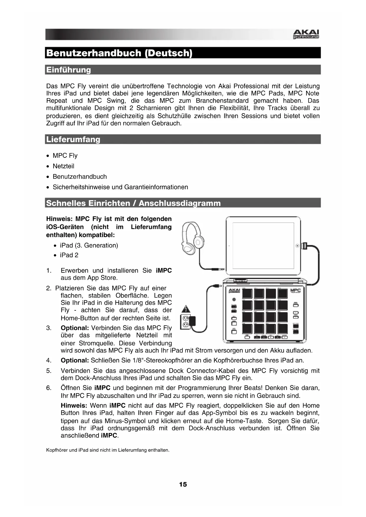 - Sicherheitshinweise und Garantieinformationen Schnelles Einrichten / Anschlussdiagramm Hinweis: MPC Fly ist mit den folgenden iOS-Geräten (nicht im Lieferumfang enthalten) kompatibel: