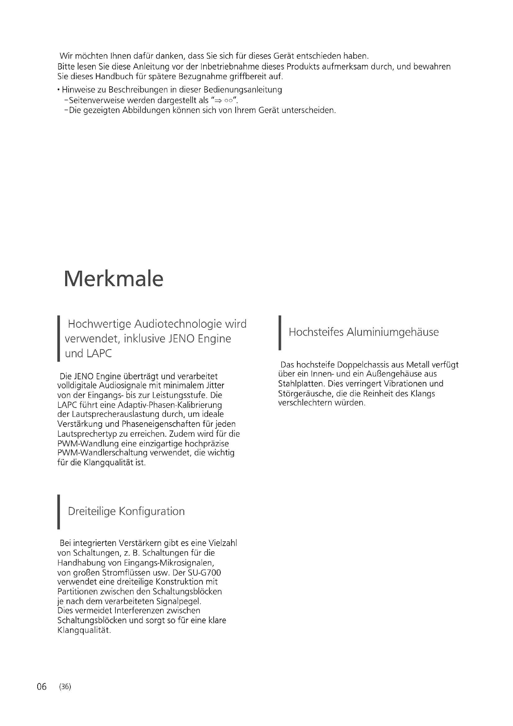 - Hinweise zu Beschreibungen in dieser Bedienungsanleitung - Seitenverweise werden dargestellt als “ ○○”. - Die gezeigten Abbildungen können sich von Ihrem Gerät unterscheiden. Hochwertige Audiotechnologie wird verwendet, inklusive JENO Engine und LAPC Die JENO Engine überträgt und verarbeitet volldigitale Audiosignale mit minimalem Jitter von der Eingangs- bis zur Leistungsstufe. Die LAPC führt eine Adaptiv-Phasen-Kalibrierung der Lautsprecherauslastung durch, um ideale Verstärkung und Phaseneigenschaften für jeden Lautsprechertyp zu erreichen. Zudem wird für die PWM-Wandlung eine einzigartige hochpräzise PWM-Wandlerschaltung verwendet, die wichtig für die Klangqualität ist. Dreiteilige Konfiguration Bei integrierten Verstärkern gibt es eine Vielzahl von Schaltungen, z. B. Schaltungen für die Handhabung von Eingangs-Mikrosignalen, von großen Stromflüssen usw. Der SU-G700 verwendet eine dreiteilige Konstruktion mit Partitionen zwischen den Schaltungsblöcken je nach dem verarbeiteten Signalpegel. Dies vermeidet Interferenzen zwischen Schaltungsblöcken und sorgt so für eine klare Klangqualität. Hochsteifes Aluminiumgehäuse Das hochsteife Doppelchassis aus Metall verfügt über ein Innen- und ein Außengehäuse aus Stahlplatten. Dies verringert Vibrationen und Störgeräusche, die die Reinheit des Klangs verschlechtern würden. MerkmaleDeutsch