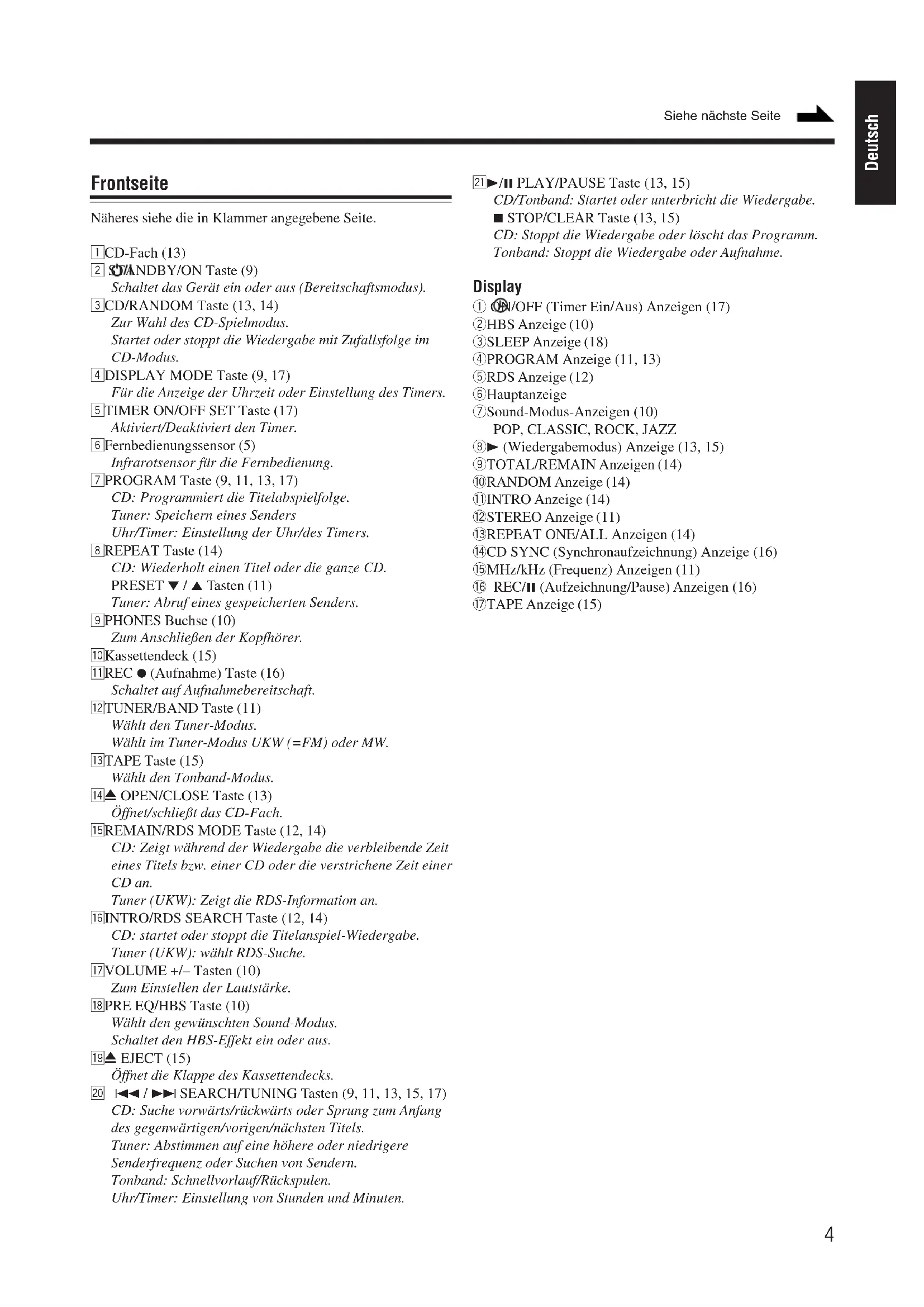 Display 02_01_22_UXM33_E_De.p65 9/20/02, 12:03 PM34 Deutsch Siehe nächste Seite Frontseite Näheres siehe die in Klammer angegebene Seite. 1 CD-Fach (13) 2 STANDBY/ON Taste (9) Schaltet das Gerät ein oder aus (Bereitschaftsmodus). 3 CD/RANDOM Taste (13, 14) Zur Wahl des CD-Spielmodus. Startet oder stoppt die Wiedergabe mit Zufallsfolge im CD-Modus. 4 DISPLAY MODE Taste (9, 17) Für die Anzeige der Uhrzeit oder Einstellung des Timers. 5 TIMER ON/OFF SET Taste (17) Aktiviert/Deaktiviert den Timer. 6 Fernbedienungssensor (5) Infrarotsensor für die Fernbedienung. 7 PROGRAM Taste (9, 11, 13, 17) CD: Programmiert die Titelabspielfolge. Tuner: Speichern eines Senders Uhr/Timer: Einstellung der Uhr/des Timers. 8 REPEAT Taste (14) CD: Wiederholt einen Titel oder die ganze CD. PRESET ∞ / 5 Tasten (11) Tuner: Abruf eines gespeicherten Senders. 9 PHONES Buchse (10) Zum Anschließen der Kopfhörer. p Kassettendeck (15) q REC ¶ (Aufnahme) Taste (16) Schaltet auf Aufnahmebereitschaft. w TUNER/BAND Taste (11) Wählt den Tuner-Modus. Wählt im Tuner-Modus UKW (=FM) oder MW. e TAPE Taste (15) Wählt den Tonband-Modus. r 0 OPEN/CLOSE Taste (13) Öffnet/schließt das CD-Fach. t REMAIN/RDS MODE Taste (12, 14) CD: Zeigt während der Wiedergabe die verbleibende Zeit eines Titels bzw. einer CD oder die verstrichene Zeit einer CD an. Tuner (UKW): Zeigt die RDS-Information an. y INTRO/RDS SEARCH Taste (12, 14) CD: startet oder stoppt die Titelanspiel-Wiedergabe. Tuner (UKW): wählt RDS-Suche. u VOLUME +/– Tasten (10) Zum Einstellen der Lautstärke. i PRE EQ/HBS Taste (10) Wählt den gewünschten Sound-Modus. Schaltet den HBS-Effekt ein oder aus. o 0 EJECT (15) Öffnet die Klappe des Kassettendecks. ; 4 / ¢ SEARCH/TUNING Tasten (9, 11, 13, 15, 17) CD: Suche vorwärts/rückwärts oder Sprung zum Anfang des gegenwärtigen/vorigen/nächsten Titels. Tuner: Abstimmen auf eine höhere oder niedrigere Senderfrequenz oder Suchen von Sendern. Tonband: Schnellvorlauf/Rückspulen. Uhr/Timer: Einstellung von Stunden und Minuten. a 3/8 PLAY/PAUSE Taste (13, 15) CD/Tonband: Startet oder unterbricht die Wiedergabe. 7 STOP/CLEAR Taste (13, 15) CD: Stoppt die Wiedergabe oder löscht das Programm. Tonband: Stoppt die Wiedergabe oder Aufnahme. Display 1 ON/OFF (Timer Ein/Aus) Anzeigen (17) 2 HBS Anzeige (10) 3 SLEEP Anzeige (18) 4 PROGRAM Anzeige (11, 13) 5 RDS Anzeige (12) 6 Hauptanzeige 7 Sound-Modus-Anzeigen (10)