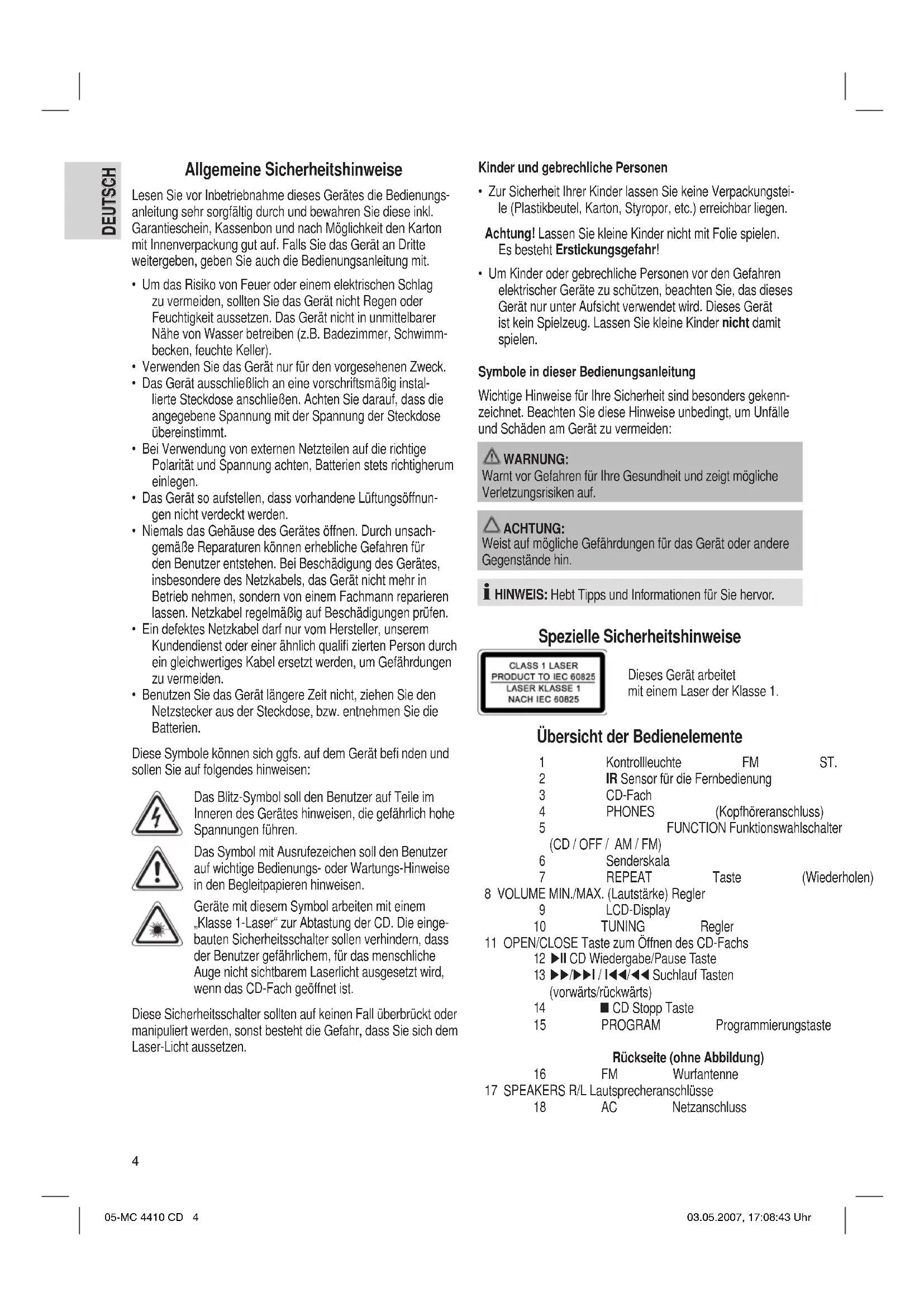 - Um Kinder oder gebrechliche Personen vor den Gefahren elektrischer Geräte zu schützen, beachten Sie, das dieses Gerät nur unter Aufsicht verwendet wird. Dieses Gerät ist kein Spielzeug. Lassen Sie kleine Kinder nicht damit spielen. Symbole in dieser Bedienungsanleitung Wichtige Hinweise für Ihre Sicherheit sind besonders gekenn- zeichnet. Beachten Sie diese Hinweise unbedingt, um Unfälle und Schäden am Gerät zu vermeiden: WARNUNG: Warnt vor Gefahren für Ihre Gesundheit und zeigt mögliche Verletzungsrisiken auf. ACHTUNG: Weist auf mögliche Gefährdungen für das Gerät oder andere Gegenstände hin. HINWEIS: Hebt Tipps und Informationen für Sie hervor. Spezielle Sicherheitshinweise Dieses Gerät arbeitet mit einem Laser der Klasse 1. Übersicht der Bedienelemente 1 Kontrollleuchte FM ST. 2 IR Sensor für die Fernbedienung 3 CD-Fach 4 PHONES (Kopfhöreranschluss) 5 FUNCTION Funktionswahlschalter (CD / OFF / AM / FM) 6 Senderskala 7 REPEAT Taste (Wiederholen) 8 VOLUME MIN./MAX. (Lautstärke) Regler 9 LCD-Display 10 TUNING Regler 11 OPEN/CLOSE Taste zum Öffnen des CD-Fachs 12 II CD Wiedergabe/Pause Taste 13 /I / I/ Suchlauf Tasten (vorwärts/rückwärts) 14 CD Stopp Taste 15 PROGRAM Programmierungstaste Rückseite (ohne Abbildung) 16 FM Wurfantenne 17 SPEAKERS R/L Lautsprecheranschlüsse 18 AC Netzanschluss 05-MC 4410 CD 4 03.05.2007, 17:08:43 Uhr5 DEUTSCH DEUTSCH Fernbedienung A II Wiedergabe/Pause Taste B STOP Taste C INTRO Taste D PROGRAM Taste E I/ / /I SKIP/SEARCH Tasten (Suchlauf rückwärts/vorwärts) F REPEAT Taste (Wiederholen) Inbetriebnahme des Gerätes/Einführung