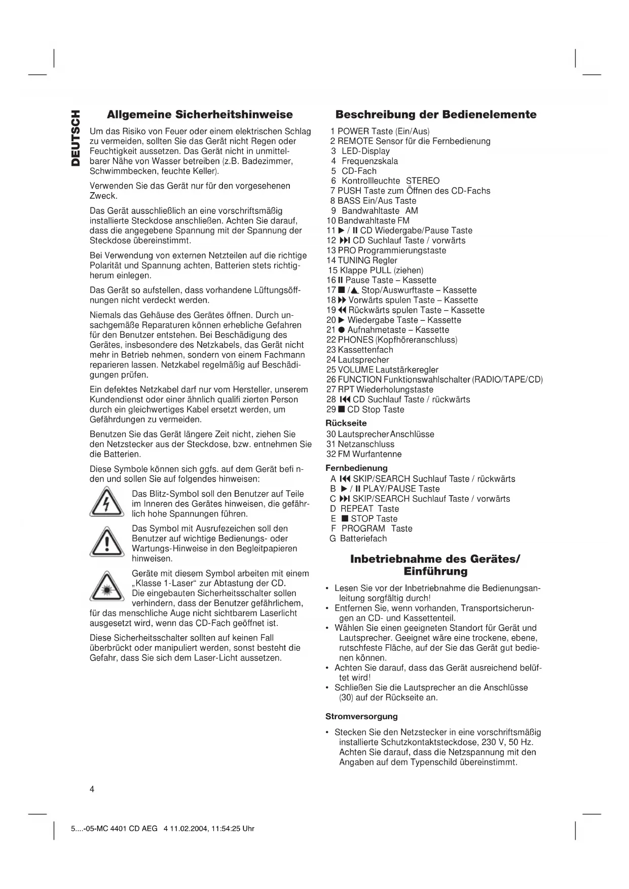 Обзор управляющих элементов .................... стр. 3 Руководство по эксплуатации........................ стр. 47 Гарантия........................................................ стр. 50 5....-05-MC 4401 CD AEG 2 11.02.2004, 11:54:23 Uhr3 Übersicht der Bedienelemente Overzicht van de bedieningselementen • Liste des différents éléments de commande Indicación de los elementos de manejo • Descrição dos elementos • Elementi di comando Oversikt over betjeningselementene • Overview of the Components Przegląd elementów obsługi • Přehled ovládacích prvků • A kezelő elemek áttekintése Обзор деталей прибора 5....-05-MC 4401 CD AEG 3 11.02.2004, 11:54:24 Uhr4 DEUTSCH Allgemeine Sicherheitshinweise Um das Risiko von Feuer oder einem elektrischen Schlag zu vermeiden, sollten Sie das Gerät nicht Regen oder Feuchtigkeit aussetzen. Das Gerät nicht in unmittel- barer Nähe von Wasser betreiben (z.B. Badezimmer, Schwimmbecken, feuchte Keller). Verwenden Sie das Gerät nur für den vorgesehenen Zweck. Das Gerät ausschließlich an eine vorschriftsmäßig installierte Steckdose anschließen. Achten Sie darauf, dass die angegebene Spannung mit der Spannung der Steckdose übereinstimmt. Bei Verwendung von externen Netzteilen auf die richtige Polarität und Spannung achten, Batterien stets richtig- herum einlegen. Das Gerät so aufstellen, dass vorhandene Lüftungsöff- nungen nicht verdeckt werden. Niemals das Gehäuse des Gerätes öffnen. Durch un- sachgemäße Reparaturen können erhebliche Gefahren für den Benutzer entstehen. Bei Beschädigung des Gerätes, insbesondere des Netzkabels, das Gerät nicht mehr in Betrieb nehmen, sondern von einem Fachmann reparieren lassen. Netzkabel regelmäßig auf Beschädi- gungen prüfen. Ein defektes Netzkabel darf nur vom Hersteller, unserem Kundendienst oder einer ähnlich qualifi zierten Person durch ein gleichwertiges Kabel ersetzt werden, um Gefährdungen zu vermeiden. Benutzen Sie das Gerät längere Zeit nicht, ziehen Sie den Netzstecker aus der Steckdose, bzw. entnehmen Sie die Batterien. Diese Symbole können sich ggfs. auf dem Gerät befi n- den und sollen Sie auf folgendes hinweisen: Das Blitz-Symbol soll den Benutzer auf Teile im Inneren des Gerätes hinweisen, die gefähr- lich hohe Spannungen führen. Das Symbol mit Ausrufezeichen soll den Benutzer auf wichtige Bedienungs- oder Wartungs-Hinweise in den Begleitpapieren hinweisen. Geräte mit diesem Symbol arbeiten mit einem „Klasse 1-Laser“ zur Abtastung der CD. Die eingebauten Sicherheitsschalter sollen verhindern, dass der Benutzer gefährlichem, für das menschliche Auge nicht sichtbarem Laserlicht ausgesetzt wird, wenn das CD-Fach geöffnet ist. Diese Sicherheitsschalter sollten auf keinen Fall überbrückt oder manipuliert werden, sonst besteht die Gefahr, dass Sie sich dem Laser-Licht aussetzen. Beschreibung der Bedienelemente 1 POWER Taste (Ein/Aus) 2 REMOTE Sensor für die Fernbedienung 3 LED-Display 4 Frequenzskala 5 CD-Fach 6 Kontrollleuchte STEREO 7 PUSH Taste zum Öffnen des CD-Fachs 8 BASS Ein/Aus Taste 9 Bandwahltaste AM 10 Bandwahltaste FM 11 / II CD Wiedergabe/Pause Taste 12 I CD Suchlauf Taste / vorwärts 13 PRO Programmierungstaste 14 TUNING Regler 15 Klappe PULL (ziehen) 16 II Pause Taste – Kassette 17 / Stop/Auswurftaste – Kassette 18 Vorwärts spulen Taste – Kassette 19 Rückwärts spulen Taste – Kassette 20 Wiedergabe Taste – Kassette 21 Aufnahmetaste – Kassette 22 PHONES (Kopfhöreranschluss) 23 Kassettenfach 24 Lautsprecher 25 VOLUME Lautstärkeregler 26 FUNCTION Funktionswahlschalter (RADIO/TAPE/CD) 27 RPT Wiederholungstaste 28 I CD Suchlauf Taste / rückwärts 29 CD Stop Taste Rückseite 30 Lautsprecher Anschlüsse 31 Netzanschluss 32 FM Wurfantenne Fernbedienung A I SKIP/SEARCH Suchlauf Taste / rückwärts B / II PLAY/PAUSE Taste C I SKIP/SEARCH Suchlauf Taste / vorwärts D REPEAT Taste E STOP Taste F PROGRAM Taste G Batteriefach Inbetriebnahme des Gerätes/ Einführung