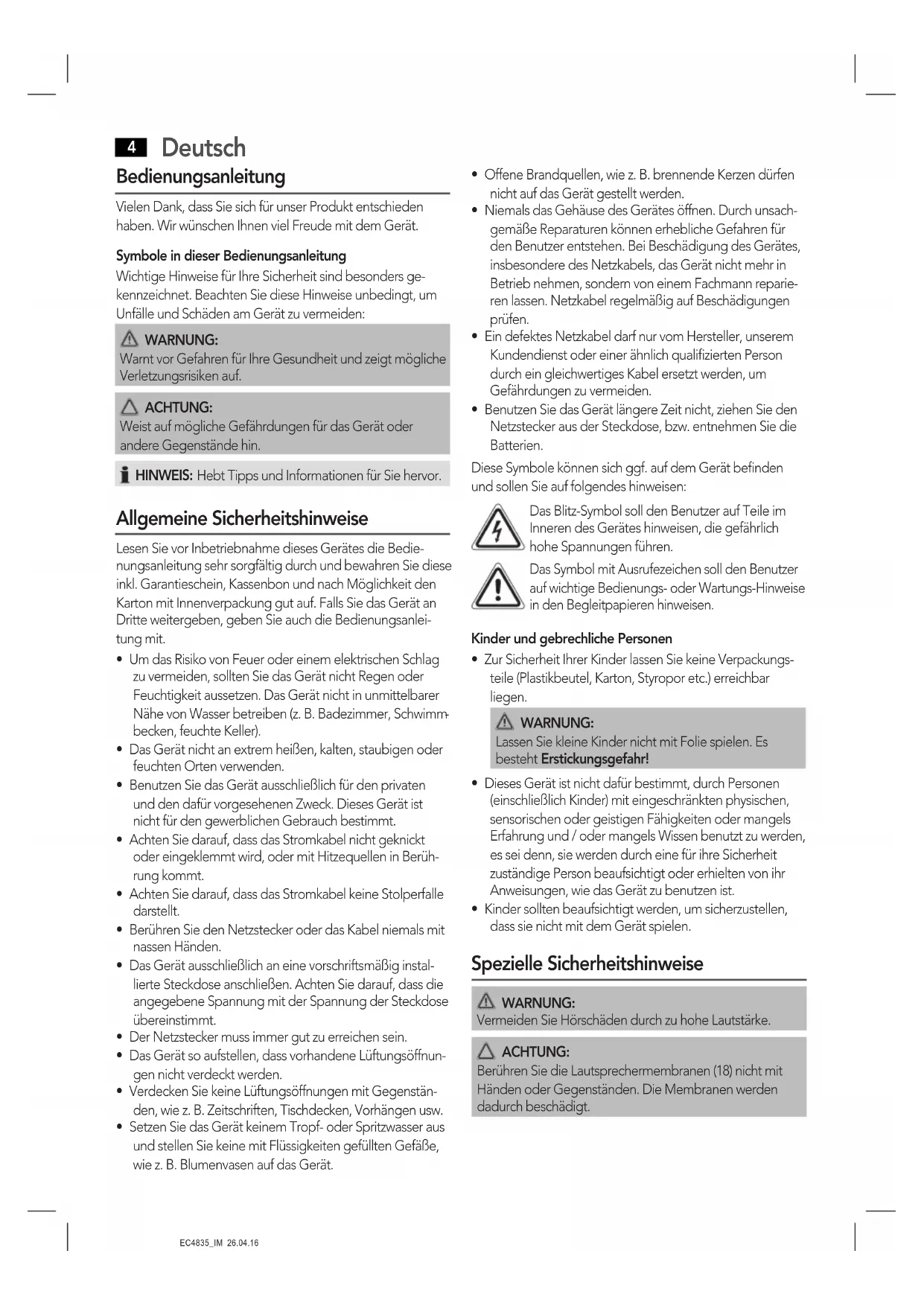 - Äußere Flecken können Sie mit einem leicht feuchten Tuch, ohne Zusatzmittel, abwischen. Störungsbehebung Fehler Ursache Lösung Gerät lässt sich nicht bedienen. Gerät blockiert „hängt fest“. Ziehen Sie für ca. 5 Sekunden den Netz- stecker aus der Steck- dose. Schalten Sie das Gerät anschließend wieder ein. Kein Ton. Lautstärke ist runter geregelt. Erhöhen Sie die Lautstärke. Schlechte Tonqualität. Radiosignal zu schwach. Versuchen Sie eine Veränderung der Antennenposition. Fehler Ursache Lösung Kein Audio- signal bei Bluetooth- Verbindung. Das Gerät ist nicht an der Audioquelle angemeldet. Überprüfen Sie, ob die Verbindung be- steht. Melden Sie ggf. das Gerät erneut an der Audioquelle an. Lautstärke zu gering. Erhöhen Sie die Lautstärke am Gerät. Erhöhen Sie die Lautstärke an der Audioquelle. Gerät lässt sich nicht verbinden. Anmeldung funktioniert nicht. Überprüfen Sie, ob die Audioquelle das A2DP Protokoll unterstützt. Audioquelle ist ausgeschaltet. Schalten Sie die Audioquelle ein. Bluetooth ist an der Audioquelle ausgeschaltet. Schalten Sie die Bluetooth Funktion in der Audioquelle ein. Bluetooth- Version wird nicht unter- stützt. Verwenden Sie ein anderes Abspielgerät. Schriller Pfeifton bei Mikrofon- Betrieb. Akustische Rückkopplung. Verwenden Sie das Mikrofon außerhalb der Lautsprecher- Abstrahlzone. Technische Daten Modell: ..................................................................................EC 4835 Spannungsversorgung: ......................... AC 100 − 240 V, 50 / 60 Hz Leistungsaufnahme: ................................................................. 42 W Schutzklasse: ..................................................................................... Nettogewicht: .................................................................. ca. 8,15 kg Radioteil Frequenzbereiche: ..................................FM 87,5 ~ 108,0 MHz Bluetooth Bluetooth Unterstützung: ..............................................V 2.1+EDR Reichweite: ................................................................... ca. 15 Meter Sendefrequenz: .................................................. 2,402 − 2,480 GHz Protokolle: .................................................................. A2DP / AVRCP Technische und gestalterische Änderungen im Zuge stetiger Produktentwicklungen vorbehalten.Deutsch