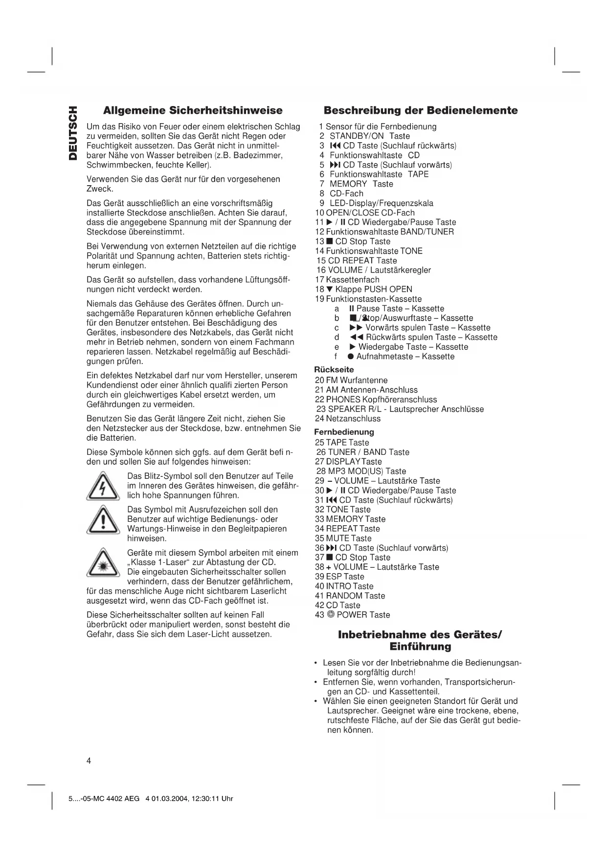 Обзор управляющих элементов .................... стр. 3 Руководство по эксплуатации........................ стр. 51 Гарантия........................................................ стр. 54 5....-05-MC 4402 AEG 2 01.03.2004, 12:30:10 UhrÜbersicht der Bedienelemente Overzicht van de bedieningselementen • Liste des différents éléments de commande Indicación de los elementos de manejo • Descrição dos elementos • Elementi di comando Oversikt over betjeningselementene • Overview of the Components Przegląd elementów obsługi • Přehled ovládacích prvků • A kezelő elemek áttekintése Обзор деталей прибора 5....-05-MC 4402 AEG 3 01.03.2004, 12:30:11 Uhr4 DEUTSCH Allgemeine Sicherheitshinweise Um das Risiko von Feuer oder einem elektrischen Schlag zu vermeiden, sollten Sie das Gerät nicht Regen oder Feuchtigkeit aussetzen. Das Gerät nicht in unmittel- barer Nähe von Wasser betreiben (z.B. Badezimmer, Schwimmbecken, feuchte Keller). Verwenden Sie das Gerät nur für den vorgesehenen Zweck. Das Gerät ausschließlich an eine vorschriftsmäßig installierte Steckdose anschließen. Achten Sie darauf, dass die angegebene Spannung mit der Spannung der Steckdose übereinstimmt. Bei Verwendung von externen Netzteilen auf die richtige Polarität und Spannung achten, Batterien stets richtig- herum einlegen. Das Gerät so aufstellen, dass vorhandene Lüftungsöff- nungen nicht verdeckt werden. Niemals das Gehäuse des Gerätes öffnen. Durch un- sachgemäße Reparaturen können erhebliche Gefahren für den Benutzer entstehen. Bei Beschädigung des Gerätes, insbesondere des Netzkabels, das Gerät nicht mehr in Betrieb nehmen, sondern von einem Fachmann reparieren lassen. Netzkabel regelmäßig auf Beschädi- gungen prüfen. Ein defektes Netzkabel darf nur vom Hersteller, unserem Kundendienst oder einer ähnlich qualifi zierten Person durch ein gleichwertiges Kabel ersetzt werden, um Gefährdungen zu vermeiden. Benutzen Sie das Gerät längere Zeit nicht, ziehen Sie den Netzstecker aus der Steckdose, bzw. entnehmen Sie die Batterien. Diese Symbole können sich ggfs. auf dem Gerät befi n- den und sollen Sie auf folgendes hinweisen: Das Blitz-Symbol soll den Benutzer auf Teile im Inneren des Gerätes hinweisen, die gefähr- lich hohe Spannungen führen. Das Symbol mit Ausrufezeichen soll den Benutzer auf wichtige Bedienungs- oder Wartungs-Hinweise in den Begleitpapieren hinweisen. Geräte mit diesem Symbol arbeiten mit einem „Klasse 1-Laser“ zur Abtastung der CD. Die eingebauten Sicherheitsschalter sollen verhindern, dass der Benutzer gefährlichem, für das menschliche Auge nicht sichtbarem Laserlicht ausgesetzt wird, wenn das CD-Fach geöffnet ist. Diese Sicherheitsschalter sollten auf keinen Fall überbrückt oder manipuliert werden, sonst besteht die Gefahr, dass Sie sich dem Laser-Licht aussetzen. Beschreibung der Bedienelemente 1 Sensor für die Fernbedienung 2 STANDBY/ON Taste 3 I CD Taste (Suchlauf rückwärts) 4 Funktionswahltaste CD 5 I CD Taste (Suchlauf vorwärts) 6 Funktionswahltaste TAPE 7 MEMORY Taste 8 CD-Fach 9 LED-Display/Frequenzskala 10 OPEN/CLOSE CD-Fach 11 / II CD Wiedergabe/Pause Taste 12 Funktionswahltaste BAND/TUNER 13 CD Stop Taste 14 Funktionswahltaste TONE 15 CD REPEAT Taste 16 VOLUME / Lautstärkeregler 17 Kassettenfach 18 Klappe PUSH OPEN 19 Funktionstasten-Kassette a II Pause Taste – Kassette b / Stop/Auswurftaste – Kassette c Vorwärts spulen Taste – Kassette d Rückwärts spulen Taste – Kassette e Wiedergabe Taste – Kassette f Aufnahmetaste – Kassette Rückseite 20 FM Wurfantenne 21 AM Antennen-Anschluss 22 PHONES Kopfhöreranschluss 23 SPEAKER R/L - Lautsprecher Anschlüsse 24 Netzanschluss Fernbedienung 25 TAPE Taste 26 TUNER / BAND Taste 27 DISPLAY Taste 28 MP3 MOD(US) Taste 29 – VOLUME – Lautstärke Taste 30 / II CD Wiedergabe/Pause Taste 31 I CD Taste (Suchlauf rückwärts) 32 TONE Taste 33 MEMORY Taste 34 REPEAT Taste 35 MUTE Taste 36 I CD Taste (Suchlauf vorwärts) 37 CD Stop Taste 38 + VOLUME – Lautstärke Taste 39 ESP Taste 40 INTRO Taste 41 RANDOM Taste 42 CD Taste