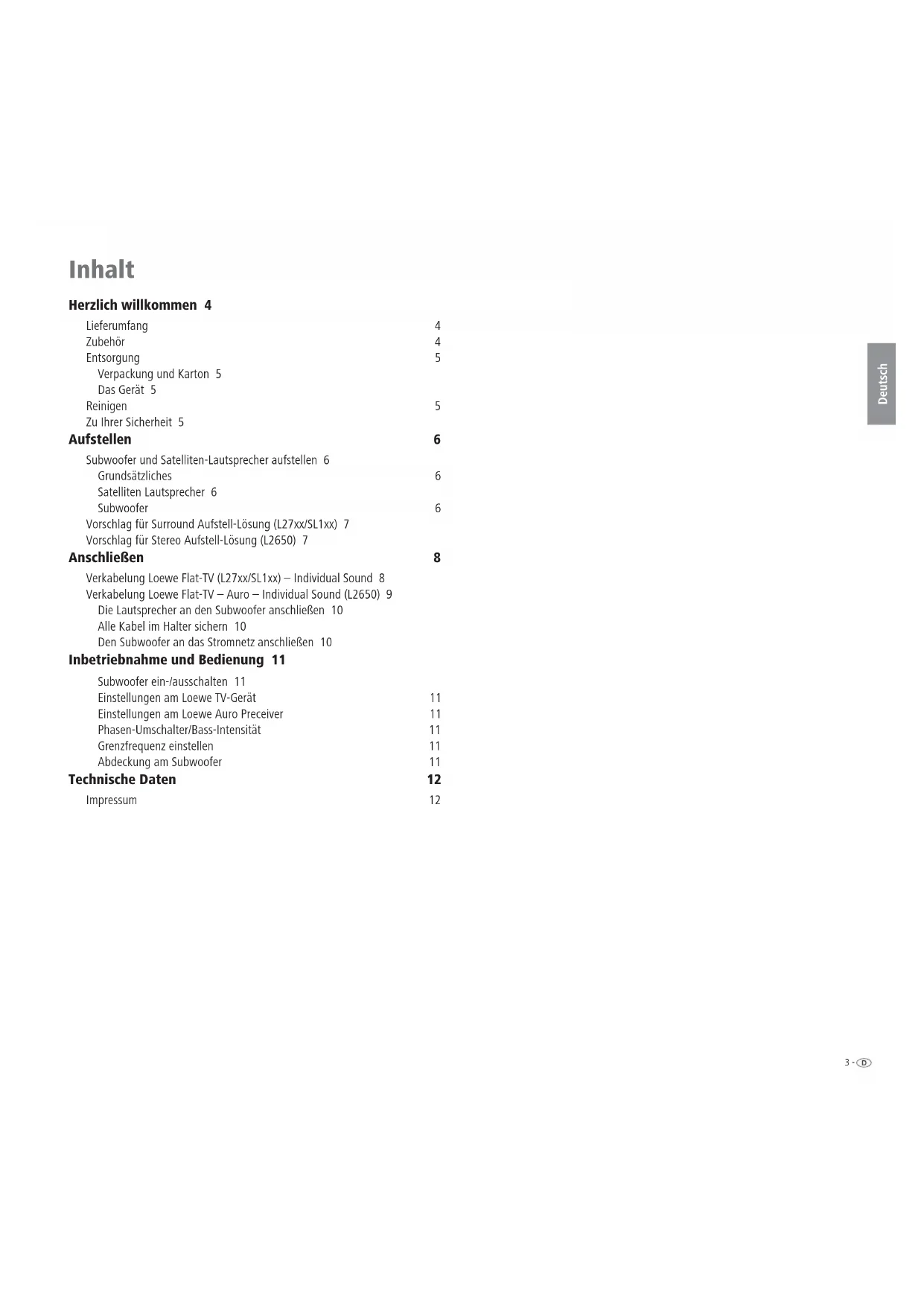 Bornes de raccordement pour haut-parleurs stand/satellites Morsetti per il collegamento di altoparlanti stand/satellitari Terminales de conexión para altavoces stand/satélites aansluitklemmen voor sprekers stand/satellietluid3 - Deutsch Inhalt Herzlich willkommen 4 Lieferumfang 4 Zubehör 4 Entsorgung 5 Verpackung und Karton 5 Das Gerät 5 Reinigen 5 Zu Ihrer Sicherheit 5 Aufstellen 6 Subwoofer und Satelliten-Lautsprecher aufstellen 6 Grundsätzliches 6 Satelliten Lautsprecher 6 Subwoofer 6 Vorschlag für Surround Aufstell-Lösung (L27xx/SL1xx) 7 Vorschlag für Stereo Aufstell-Lösung (L2650) 7 Anschließen 8 Verkabelung Loewe Flat-TV (L27xx/SL1xx) – Individual Sound 8 Verkabelung Loewe Flat-TV – Auro – Individual Sound (L2650) 9 Die Lautsprecher an den Subwoofer anschließen 10 Alle Kabel im Halter sichern 10 Den Subwoofer an das Stromnetz anschließen 10 Inbetriebnahme und Bedienung 11 Subwoofer ein-/ausschalten 11 Einstellungen am Loewe TV-Gerät 11 Einstellungen am Loewe Auro Preceiver 11 Phasen-Umschalter/Bass-Intensität 11 Grenzfrequenz einstellen 11 Abdeckung am Subwoofer 11 Technische Daten 12 Impressum 12- 4 Deutsch Herzlich willkommen Vielen Dank, dass Sie sich für ein Loewe Produkt entschieden haben. Wir freuen uns, Sie als Kunden gewonnen zu haben. Mit Loewe verbinden wir höchste Ansprüche an Technik, Design und Bediener- freundlichkeit. Dies gilt für TV, DVD, Video, Audio und Zubehör glei cher ma ßen. Dabei sollen weder die Technik noch das Design einen Selbstzweck erfüllen, sondern unseren Kunden einen höchstmöglichen Seh- und Hörgenuss ver mit teln. Auch beim Design haben wir uns nicht von kurzfristigen, modischen Trends leiten lassen. Denn schließlich haben Sie ein hochqualitatives Gerät erworben, an dem Sie sich auch morgen und übermorgen nicht satt sehen sollen. Das Individual Sound Lautsprecher-System ist abgestimmt auf Loewe Flat TV- Geräte. Das Lautsprechersystem ist dabei individuell ausbaubar von einer einfachen Stereo Kombination über eine Variante mit vier Satelliten-Lautsprechern bis hin zur hochwertigsten Lösung mit vier Standlautsprechern. Mit dabei ist jeweils der Subwoofer mit integriertem Verstärker. Sie können so DVDs in Dolby Digital Kinoqualität wiedergeben. Sie können aber auch Stereo-Sendungen oder Stereo-Wiedergaben (vom Videorecorder oder DVD Player) in Dolby ProLogic, bzw. Virtual oder Circle Surround in ein quasi 5.1 Surround-Signal umwandeln und mit dem Individual Sound Lautsprecher-System wiedergeben. Ist Ihr TV-Gerät (ab Chassis L27xx) mit einem digitalen Tuner (DVB) ausgerüstet, wird das empfangene digitale Surround-Signal decodiert und über die Individual Sound-Anlage wiedergegeben. Die Individual Sound Lautsprecheranlage schaltet sich automatisch mit dem Loewe Flat TV-Gerät oder dem Loewe DVD Preceiver ein und aus. Die Einstellungen für Dolby Digital nehmen Sie komfortabel über die Menüs des Loewe Flat TV-Gerätes vor, bzw. bei Verwendung des DVD Preceivers Auro/Audi- ovision über dessen Menüs. Sie können dieses Lautsprecher-System auch an einem externen Decoder be- treiben. Dann gehen jedoch die Loewe Systemvorteile verloren. Die Bedienung entnehmen Sie dann Ihrem Decoder (AV-Receiver). Für die Satelliten Lautsprecher S1 ist dabei eine untere Grenzfrequenz von 150 Hz, für die Standbox L1 90 Hz einzustellen. Lautsprecherabdeckung Lieferumfang Subwoofer I Sound, Best. Nr. 66213D/T/U10
