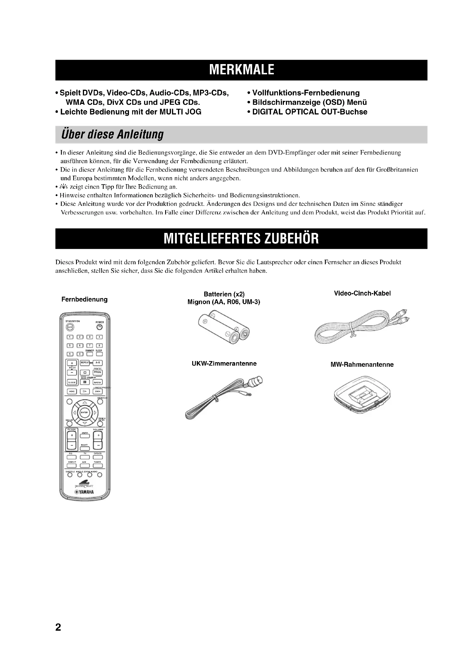 - Diese Anleitung wurde vor der Produktion gedruckt. Änderungen des Designs und der technischen Daten im Sinne ständiger Verbesserungen usw. vorbehalten. Im Falle einer Differenz zwischen der Anleitung und dem Produkt, weist das Produkt Priorität auf. Dieses Produkt wird mit dem folgenden Zubehör geliefert. Bevor Sie die Lautsprecher oder einen Fernseher an dieses Produkt anschließen, stellen Sie sicher, dass Sie die folgenden Artikel erhalten haben. MERKMALE Über diese Anleitung