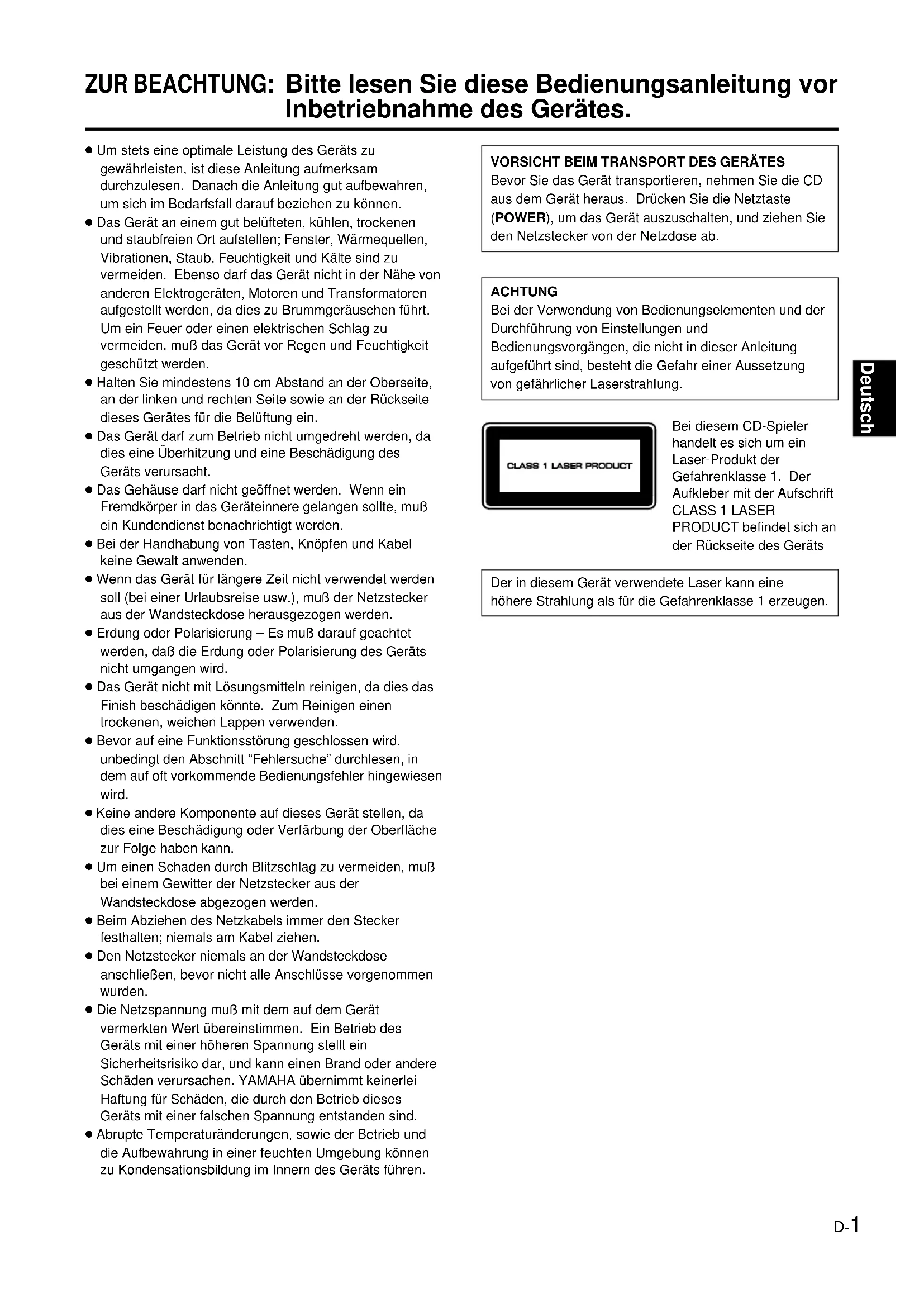 Bevor Sie das Gerät transportieren, nehmen Sie die CD aus dem Gerät heraus. Drücken Sie die Netztaste (POWER), um das Gerät auszuschalten, und ziehen Sie den Netzstecker von der Netzdose ab. ACHTUNG Bei der Verwendung von Bedienungselementen und der Durchführung von Einstellungen und Bedienungsvorgängen, die nicht in dieser Anleitung aufgeführt sind, besteht die Gefahr einer Aussetzung von gefährlicher Laserstrahlung. Bei diesem CD-Spieler handelt es sich um ein Laser-Produkt der Gefahrenklasse 1. Der Aufkleber mit der Aufschrift CLASS 1 LASER PRODUCT befindet sich an der Rückseite des Geräts Der in diesem Gerät verwendete Laser kann eine höhere Strahlung als für die Gefahrenklasse 1 erzeugen. ● Um stets eine optimale Leistung des Geräts zu gewährleisten, ist diese Anleitung aufmerksam durchzulesen. Danach die Anleitung gut aufbewahren, um sich im Bedarfsfall darauf beziehen zu können. ● Das Gerät an einem gut belüfteten, kühlen, trockenen und staubfreien Ort aufstellen; Fenster, Wärmequellen, Vibrationen, Staub, Feuchtigkeit und Kälte sind zu vermeiden. Ebenso darf das Gerät nicht in der Nähe von anderen Elektrogeräten, Motoren und Transformatoren aufgestellt werden, da dies zu Brummgeräuschen führt. Um ein Feuer oder einen elektrischen Schlag zu vermeiden, muß das Gerät vor Regen und Feuchtigkeit geschützt werden. ● Halten Sie mindestens 10 cm Abstand an der Oberseite, an der linken und rechten Seite sowie an der Rückseite dieses Gerätes für die Belüftung ein. ● Das Gerät darf zum Betrieb nicht umgedreht werden, da dies eine Überhitzung und eine Beschädigung des Geräts verursacht. ● Das Gehäuse darf nicht geöffnet werden. Wenn ein Fremdkörper in das Geräteinnere gelangen sollte, muß ein Kundendienst benachrichtigt werden. ● Bei der Handhabung von Tasten, Knöpfen und Kabel keine Gewalt anwenden. ● Wenn das Gerät für längere Zeit nicht verwendet werden soll (bei einer Urlaubsreise usw.), muß der Netzstecker aus der Wandsteckdose herausgezogen werden. ● Erdung oder Polarisierung – Es muß darauf geachtet werden, daß die Erdung oder Polarisierung des Geräts nicht umgangen wird. ● Das Gerät nicht mit Lösungsmitteln reinigen, da dies das Finish beschädigen könnte. Zum Reinigen einen trockenen, weichen Lappen verwenden. ● Bevor auf eine Funktionsstörung geschlossen wird, unbedingt den Abschnitt “Fehlersuche” durchlesen, in dem auf oft vorkommende Bedienungsfehler hingewiesen wird. ● Keine andere Komponente auf dieses Gerät stellen, da dies eine Beschädigung oder Verfärbung der Oberfläche zur Folge haben kann. ● Um einen Schaden durch Blitzschlag zu vermeiden, muß bei einem Gewitter der Netzstecker aus der Wandsteckdose abgezogen werden. ● Beim Abziehen des Netzkabels immer den Stecker festhalten; niemals am Kabel ziehen. ● Den Netzstecker niemals an der Wandsteckdose anschließen, bevor nicht alle Anschlüsse vorgenommen wurden. ● Die Netzspannung muß mit dem auf dem Gerät vermerkten Wert übereinstimmen. Ein Betrieb des Geräts mit einer höheren Spannung stellt ein Sicherheitsrisiko dar, und kann einen Brand oder andere Schäden verursachen. YAMAHA übernimmt keinerlei Haftung für Schäden, die durch den Betrieb dieses Geräts mit einer falschen Spannung entstanden sind. ● Abrupte Temperaturänderungen, sowie der Betrieb und die Aufbewahrung in einer feuchten Umgebung können zu Kondensationsbildung im Innern des Geräts führen. ZUR BEACHTUNG: Bitte lesen Sie diese Bedienungsanleitung vor Inbetriebnahme des Gerätes.D-2 HINWEISE FÜR CDs CDs die sich mit diesem Gerät wiedergeben lassen Verwenden Sie diesen CD-Spieler ausschließlich für dieWiedergabe von CDs, die mit den folgenden Markierungenbezeichnet sind. Legen Sie niemals eine andere Platte ein.Mit diesem Gerät können auch 8cm CD-Singles abgespieltwerden..... CDs (digitale Audio-CDs)Diese Audio-CDs sind am weitestenverbreitet..... CD-RW (wiederbeschreibbar)Diese CDs lassen sich mit einemspeziellen CD-Recorder fürAudioaufnahmen wiederholt beschreiben.Die aufgezeichneten CD-RWs lassensich nur in einem speziellen, für CD-RWsgeeigneten CD-Spieler wiedergeben.Hinweise● Verwenden Sie nur CD-RWs vonbekannten Herstellern.● Verwenden Sie eine CD-RW, diemindestens einen der folgendenSchriftzüge trägt.FOR CONSUMERFOR CONSUMER USEFOR MUSIC USE ONLY.... CD-TEXTAuf solchen CDs werden Textdaten, wieAlbumtitel, Liedertitel und Künstlernamenaufgezeichnet. Sie lassen sich vonüblichen CD-Spielern wiedergeben.Allerdings sind für die Wiedergabe desTextes spezielle für die Textwiedergabegeeignete CD-Spieler erforderlich.Mit dem CDX-596 ist es möglich Textvon einer CD-TEXT wiederzugeben.HinweisEs ist möglich, daß sich gewisse CD-RWs oder andereCDs, die nicht richtig aufgezeichnet wurden, nicht mitdiesem CD-Spieler wiedergeben lassen.Zur Verhinderung von Gerätestörungen:● Verwenden Sie keine Nicht-Standard-CDs, wie z.B. herzförmigeCDs, die auf dem Markt erhältlichsind, weil sie das Gerätbeschädigen können.● Verwenden Sie keine mit Klebebändern, Etikettenoder Klebemittel. Bei Verwendung einer solchen CDkann die CD im Gerät steckenbleiben oderGerätebeschädigungen verursachen. Hinweise für die Handhabung von CDs ● Behandeln Sie die Platten stets sorgfältig, so daß dieOberfläche nicht verkratzt wird.● CDs werden durch die Wiedergabe nicht abgenutzt aberBeschädigungen durch unsachgemäße Handhabungkönnen die Wiedergabequalität beeinträchtigen.● Verwenden Sie nur einen Filzstift oder etwas ähnliches,wenn Sie auf der Beschriftungsseite der CD schreiben.Verwenden Sie niemals einen Kugelschreiber, Bleistiftusw. mit harter Spitze, da sonst die CD-Wiedergabebeeinträchtigt werden kann.● Die CDs dürfen nicht verbogen werden.● Wenn eine Disc z.Z. nicht verwendet wird, nehmen Sieaus dem Gerät und bewahren Sie sie in der Schutzbox auf. ● Beim Entfernen und Aufbewahren darf die Oberfläche derCD nicht verkratzt werden.