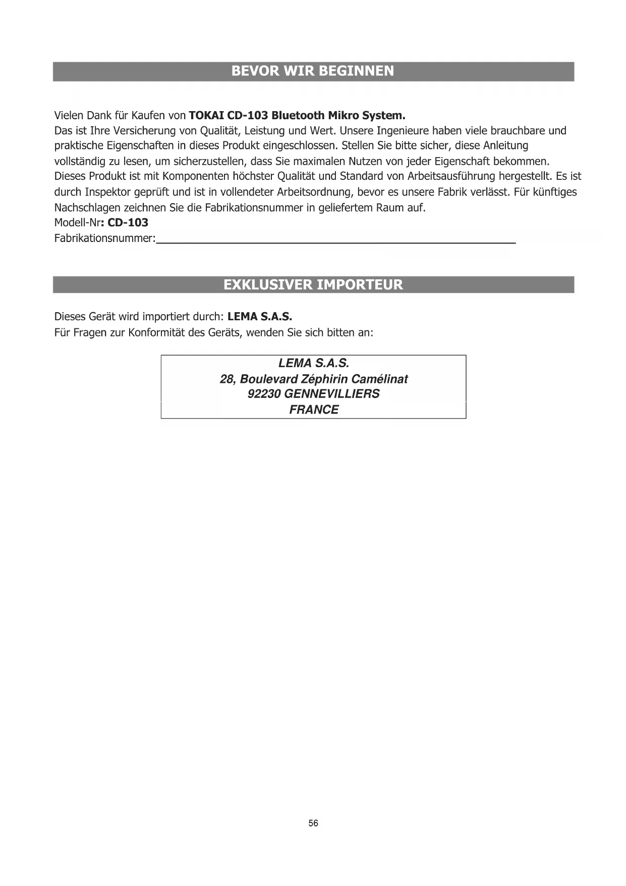 Vielen Dank für Kaufen von TOKAI CD-103 Bluetooth Mikro System. Das ist Ihre Versicherung von Qualität, Leistung und Wert. Unsere Ingenieure haben viele brauchbare und praktische Eigenschaften in dieses Produkt eingeschlossen. Stellen Sie bitte sicher, diese Anleitung vollständig zu lesen, um sicherzustellen, dass Sie maximalen Nutzen von jeder Eigenschaft bekommen. Dieses Produkt ist mit Komponenten höchster Qualität und Standard von Arbeitsausführung hergestellt. Es ist durch Inspektor geprüft und ist in vollendeter Arbeitsordnung, bevor es unsere Fabrik verlässt. Für künftiges Nachschlagen zeichnen Sie die Fabrikationsnummer in geliefertem Raum auf. Modell-Nr: CD-103 Fabrikationsnummer:____________________________________________________