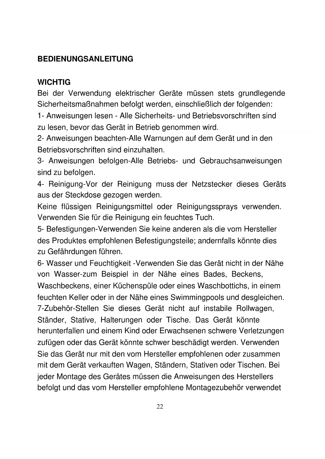 6- Wasser und Feuchtigkeit -Verwenden Sie das Gerät nicht in der Höhe von Wasser-zum Beispiel in der Höhe eines Bades, Beckens, Waschbeckens, einer Kuchensprüle oder eines Waschbottichs, in einem feuchten Keller oder in der Höhe eines Swimmingpools und desgleichen.