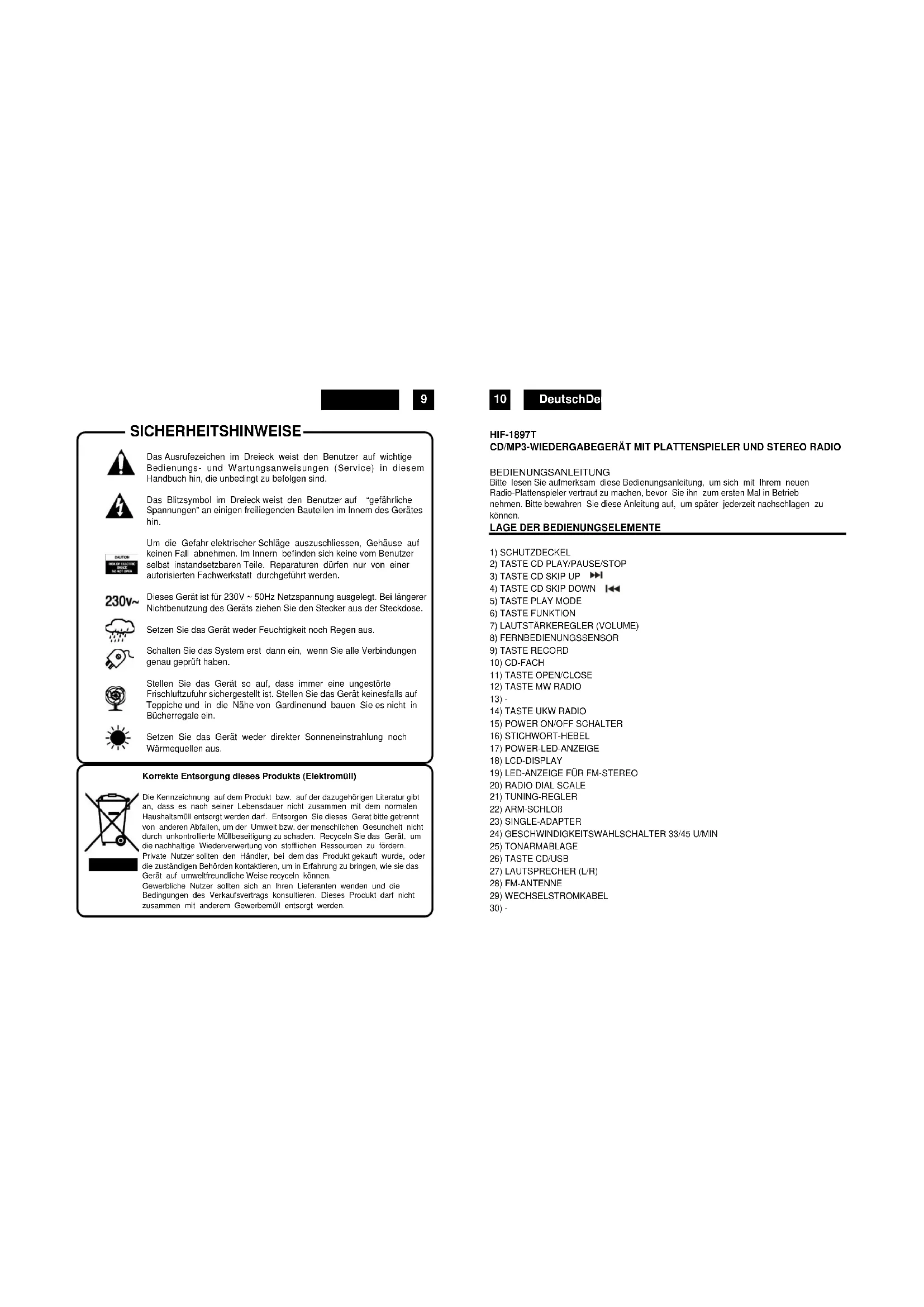 HIF-1897T CD/MP3-WIEDERGABEGERÄT MIT PLATTENSPIELER UND STEREO RADIO BEDIENUNGSANLEITUNG Bitte lesen Sie aufmerksam diese Bedienungsanleitung, um sich mit Ihrem neuen Radio-Plattenspieler vertraut zu machen, bevor Sie ihn zum ersten Mal in Betrieb nehmen. Bitte bewahren Sie diese Anleitung auf, um später jederzeit nachschlagen zu können.