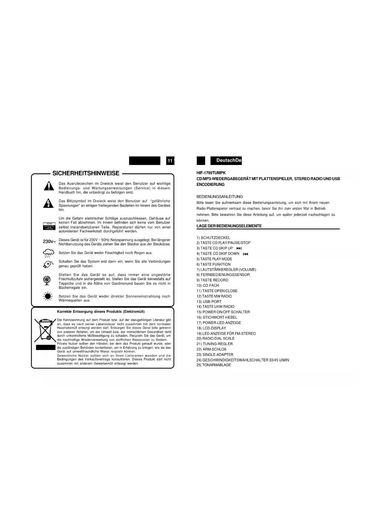 HIF-1799TUMPK CD/MP3-WIEDERGABEGERÄT MIT PLATTENSPIELER, STEREO RADIO UND USB ENCODIERUNG BEDIENUNGSANLEITUNG Bitte lesen Sie aufmerksam diese Bedienungsanleitung, um sich mit Ihrem neuen Radio-Plattenspieler vertraut zu machen, bevor Sie ihn zum ersten Mal in Betrieb nehmen. Bitte bewahren Sie diese Anleitung auf, um später jederzeit nachschlagen zu können.