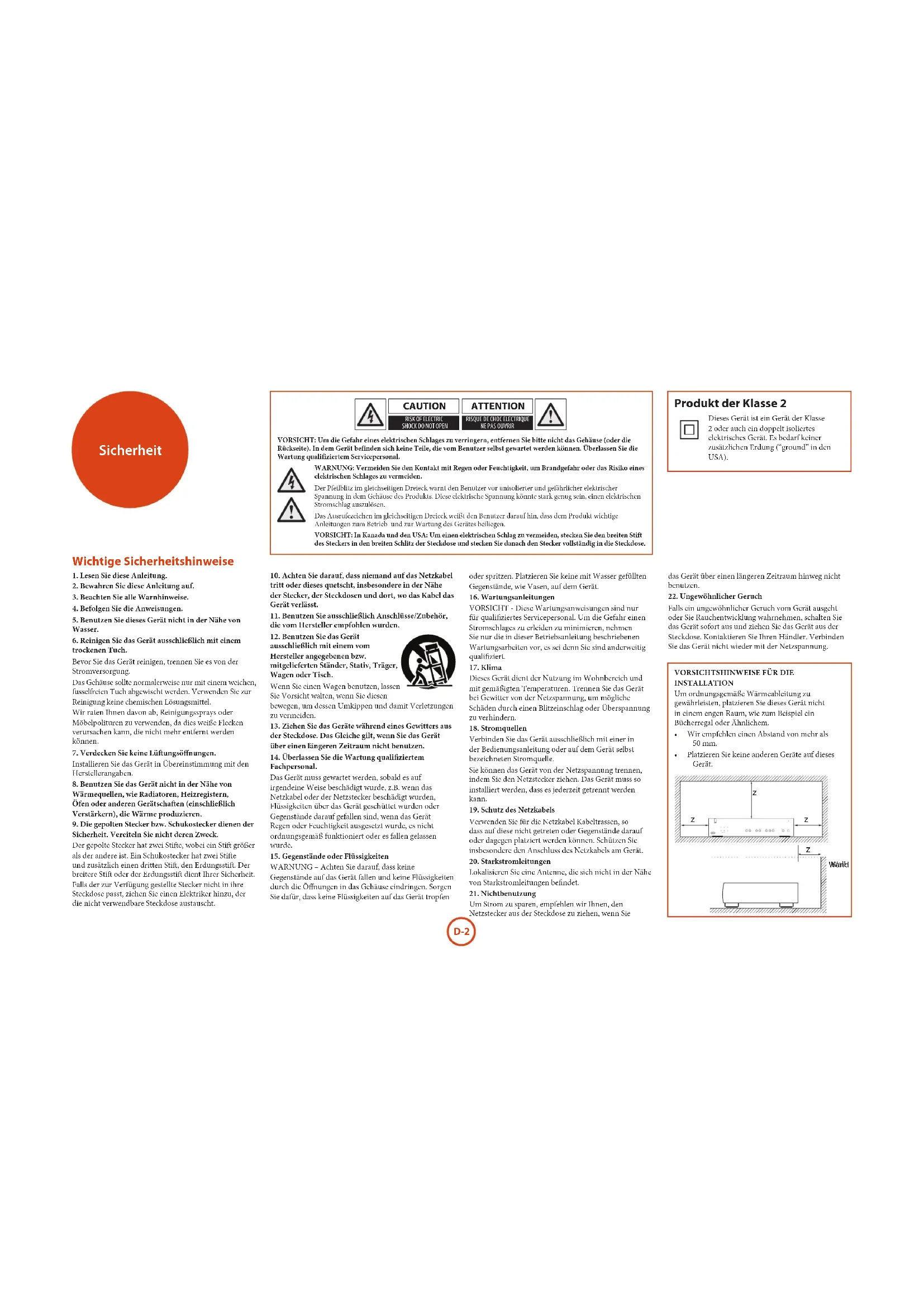 VORSICHT: Um die Gefahr eines elektrischen Schlages zu verringern, entfernen Sie bitte nicht das Gehäuse (oder die Rückseite). In dem Gerät befinden sich keine Teile, die vom Benutzer selbst gewartet werden können. Überlassen Sie die Wartung qualifiziertem Servicepersonal.WARNUNG: Vermeiden Sie den Kontakt mit Regen oder Feuchtigkeit, um Brandgefahr oder das Risiko eines elektrischen Schlages zu vermeiden.Der Pfeilblitz im gleichseitigen Dreieck warnt den Benutzer vor unisolierter und gefährlicher elektrischer Spannung in dem Gehäuse des Produkts. Diese elektrische Spannung könnte stark genug sein, einen elektrischen Stromschlag auszulösen.Das Ausrufezeichen im gleichseitigen Dreieck weißt den Benutzer darauf hin, dass dem Produkt wichtige Anleitungen zum Betrieb und zur Wartung des Gerätes beiliegen.VORSICHT: In Kanada und den USA: Um einen elektrischen Schlag zu vermeiden, stecken Sie den breiten Stift des Steckers in den breiten Schlitz der Steckdose und stecken Sie danach den Stecker vollständig in die Steckdose. Produkt der Klasse 2 DiesesGerätisteinGerätderKlasse2 oder auch ein doppelt isoliertes elektrisches Gerät. Es bedarf keiner zusätzlichen Erdung (“ground” in den USA).