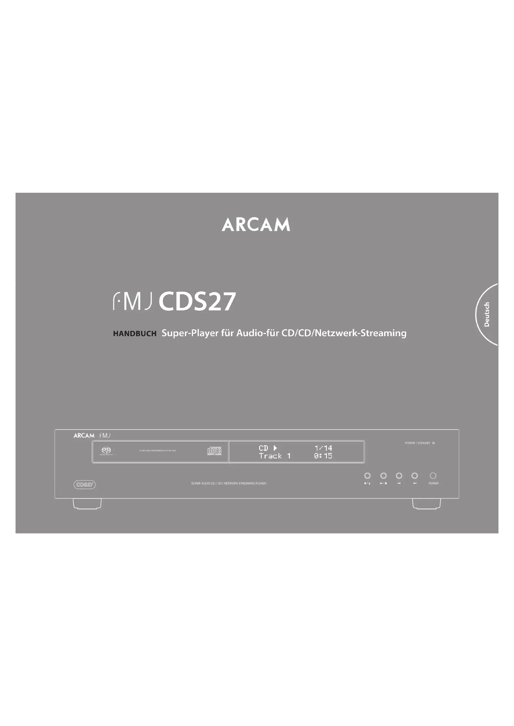 DISP Geht zyklisch durch die Helligkeitsoptionen des Displays auf der Frontblende MODE Ändert den Display-Modus von Arcam-BD-Playern. Schneller Rücklauf. Schneller Vorlauf. Zurück an den Anfang des aktuellen bzw. vorigen Tracks. Springt zum Anfang des nächsten Tracks. Wiedergabe beenden. Wiedergeben. Schaltet die Wiedergabe zwischen Pause und Abspielen um.AUDIOWechselt zwischen den Audio-Decodierungsformaten (Dolby Digital, DTS usw.). MENU Aktiviert das Menü des BD-Players.Navigiert durch Tracklisten, wenn dies vom Player unterstützt wird. wählt den momentan hervorgehobenen Track, falls dies von dem Player unterstützt wird. Kehrt zur obersten Ebene des Menüs („Start“) zurück. RTN Drücken Sie beim Navigieren in den Menüs diese Taste, um zum vorherigen Bildschirm oder Auswahl zurückzukehren.SHUFFSchaltet die Zufallswiedergabe („shue“) ein oder aus. RPT Wiederholt die Wiedergabe der Disk oder eine vorprogrammierte Auswahl von Tracks. Um einen bestimmten Track zu wiederholen, wählen Sie den Track aus und drücken Sie dann zweimal RPT. Um die Wiederhol- Funktion abzubrechen, drücken Sie RPT ein drittes Mal. SACD Schaltet zwischen der Auswahl der HD- und CD-Ebene einer SACD-Disk um.D-13D-12 Deutsch Problem Mögliche Ursache Abhilfe Keine Stromversorgung < Das Netzkabel ist nicht angeschlossen. < Schlechter Kontakt an der Steckdose oder die Steckdose wurde ausgeschaltet. < Schließen Sie das Netzkabel gut an. < Prüfen Sie die Steckdose mit einer Lampe oder einem anderen Gerät. Keine Diskwiedergabe < Die Disk wurde verkehrt herum eingelegt. < Die Disk ist nicht abspielbar. < Die Disk ist verschmutzt. < Die aufgenommene Disk wurde nicht richtig abgeschlossen. < Legen Sie die Disk mit der bedruckten Seite nach oben ein. < Verwenden Sie eine abspielbare Disk. < Reinigen Sie die Disk. < Legen Sie eine Disk ein, die richtig abgeschlossen wurde. Keine Disk/Defekte Disk < Die Disk ist verkratzt, verschmutzt, wurde schlecht aufgenommen oder nicht abspielbar. < Drücken Sie POWER, um das Gerät auszuschalten, drücken Sie erneut POWER und entfernen Sie anschließend die Disk. Kein Ton < Die Audiokabel wurden abgesteckt. < Schließen Sie die Kabel richtig an. Rauschen oder verzerrter Tone. < Die Disk ist verschmutzt. < Schlechte Verbindungen. < Reinigen Sie die Disk. < Überprüfen Sie die Verbindungen und schließen Sie alle Kabel gut an.Die Fernbedienung funktioniert nicht. < Die Batterien sind nicht eingelegt oder sind erschöp. < Der Fernbedienungssensor wurde abgedeckt. < Ersetzen Sie die Batterien. < Entfernen Sie das Hindernis. fehlerbehebung Sollte sich mit dem System ein Problem ergeben, dann überprüfen Sie zunächst mit dieser Fehlerbehebungstabelle, bevor Sie sich an den Kundendienst wenden.Wenn die Störung weiterhin besteht, versuchen Sie das Problem durch erneutes Aus- und Einschalten des Gerätes zu lösen.Wenn es Ihnen nicht gelingt, das Problem zu lösen, wenden Sie sich an Ihren Händler. Sie dürfen unter keinen Umständen versuchen, das Gerät selbst reparieren, da dies die Garantie erlöschen lässt! Ständige Verbesserungen Arcam bemüht sich um ständige Produktverbesserung. Das Design und die technischen Daten können sich deshalb ohne weitere Ankündigung ändern. technische Daten Analoge AudioausgängeDigital-/Analogwandler 24 Bit, 192 kHz Delta-Sigma DACSignal-/Rauschabstand 110 dB CCIRHarmonische Verzerrung (1 kHz) 0,002 %Frequenzgang (±0,5 dB) 10 Hz-20 kHzAusgangspegel (0 dB) 2,2 V UeAusgangsimpedanz 47 ΩMinimale empfohlene Last 5 kΩDigitale SchnittstellenAudioausgänge 75 Ω koaxialer/optischer TOSLINKUSB USB 2.0 Hochgeschwindigkeit (480 Mbit/s)Ethernet 10/100 10/100Drahtlos b/g/nÄußereAbmessungen (B x T x H) 433 x 276 x 75Gewicht 5,2 kg/7,5 kg verpacktLeistungsaufnahme maximal 20 W Mitgeliefertes ZubehörNetzkabel, CR902 Fernbedienung, 2 x AAA Batterien, WLAN-AntenneFehler und Auslassungen vorbehaltenHINWEIS: Alle Spezikationen sind typische Werte falls nicht abweichend angegeben. Funkinterferenzen Der CDS27 Player ist ein digitales Gerät, das den höchsten Anforderungen hinsichtlich seiner elektromagnetischen Verträglichkeit entspricht.Alle CD-Player erzeugen jedoch RF (Funkfrequenzen) und können diese abstrahlen. Dies kann u.U. Störungen beim UKW- und MW-Empfang verursachen. Platzieren Sie in einem solchen Fall den Player und die Verbindungskabel so weit wie möglich entfernt vom Tuner und der Antenne. Das Anschließen des Players bzw. des Empfängers/Verstärkers an getrennte Stromquellen kann ebenfalls zur Verringerung von Interferenzen beitragen.Hinweis für Länder der EU – Dieses Gerät erfüllt die Bestimmung EMV-Richtlinie 2004/108/EC.USA – Diese Geräte entsprechen Teil 15 der FCC-Bestimmungen Klasse B. Laserstrahlung Bei Betrieb des CDS27-Players ohne Gehäuse kann es durch unsichtbare Laserstrahlen zu Augenschäden kommen.KLASSE IILASERPRODUKTD-14 produkt- garantie Weltweite Garantie Sie sind berechtigt, das Gerät während der ersten zwei Jahre nach Kaufdatum bei einem autorisierten Arcam-Fachhändler kostenlos reparieren zu lassen, unter der Voraussetzung, dass es ursprünglich bei einem Arcam-Händler erworben wurde. Der Arcam-Fachhändler führt den Kundenservice nach Vertragsschluss durch. Der Hersteller übernimmt keine Verantwortung für Schäden, die durch Unfall, Missbrauch, Verschleiß, Vernachlässigung oder unzulässige Veränderungen bzw. Reparaturen entstehen. Außerdem wird keinerlei Verantwortung für Schäden oder Verlust des Gerätes während des Transports zum oder vom Garantienehmer übernommen. Die Garantie umfasst Folgendes: Teile- und Arbeitsstundenkosten bis zu zwei Jahre nach dem Kaufdatum. Nach Ablauf von zwei Jahren müssen Sie die vollen Kosten für Ersatzteile und Arbeitsstunden tragen. Versandkosten werden nicht übernommen. Inanspruchnahme der Garantie Das Gerät sollte in der Originalverpackung an den Händler zurückgegeben werden, bei dem es erworben wurde. Der Versand muss frei Haus durch 