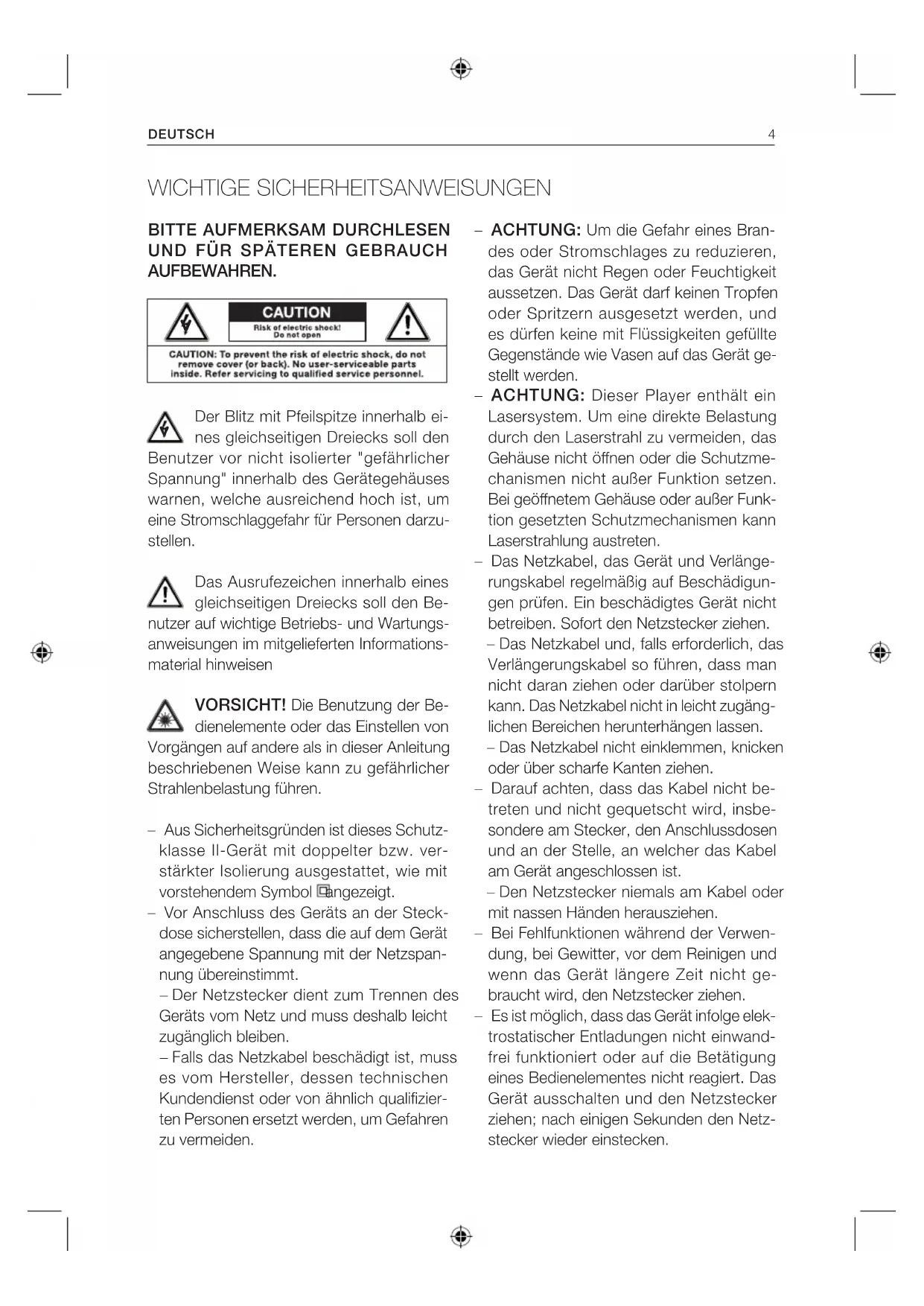 Der Blitz mit Pfeilspitze innerhalb ei- nes gleichseitigen Dreiecks soll den Benutzer vor nicht isolierter "gefährlicher Spannung" innerhalb des Gerätegehäuses warnen, welche ausreichend hoch ist, um eine Stromschlaggefahr für Personen darzu- stellen. Das Ausrufezeichen innerhalb eines gleichseitigen Dreiecks soll den Be- nutzer auf wichtige Betriebs- und Wartungs- anweisungen im mitgelieferten Informations- material hinweisen VORSICHT! Die Benutzung der Be- dienelemente oder das Einstellen von Vorgängen auf andere als in dieser Anleitung beschriebenen Weise kann zu gefährlicher Strahlenbelastung führen. – Aus Sicherheitsgründen ist dieses Schutz- klasse II-Gerät mit doppelter bzw. ver- stärkter Isolierung ausgestattet, wie mit vorstehendem Symbol angezeigt. – Vor Anschluss des Geräts an der Steck- dose sicherstellen, dass die auf dem Gerät angegebene Spannung mit der Netzspan- nung übereinstimmt. – Der Netzstecker dient zum Trennen des Geräts vom Netz und muss deshalb leicht zugänglich bleiben. – Falls das Netzkabel beschädigt ist, muss es vom Hersteller, dessen technischen Kundendienst oder von ähnlich qualifizier- ten Personen ersetzt werden, um Gefahren zu vermeiden. WICHTIGE SICHERHEITSANWEISUNGEN – ACHTUNG: Um die Gefahr eines Bran- des oder Stromschlages zu reduzieren, das Gerät nicht Regen oder Feuchtigkeit aussetzen. Das Gerät darf keinen Tropfen oder Spritzern ausgesetzt werden, und es dürfen keine mit Flüssigkeiten gefüllte Gegenstände wie Vasen auf das Gerät ge- stellt werden. – ACHTUNG: Dieser Player enthält ein Lasersystem. Um eine direkte Belastung durch den Laserstrahl zu vermeiden, das Gehäuse nicht önen oder die Schutzme- chanismen nicht außer Funktion setzen. Bei geönetem Gehäuse oder außer Funk- tion gesetzten Schutzmechanismen kann Laserstrahlung austreten. – Das Netzkabel, das Gerät und Verlänge- rungskabel regelmäßig auf Beschädigun- gen prüfen. Ein beschädigtes Gerät nicht betreiben. Sofort den Netzstecker ziehen. – Das Netzkabel und, falls erforderlich, das Verlängerungskabel so führen, dass man nicht daran ziehen oder darüber stolpern kann. Das Netzkabel nicht in leicht zugäng- lichen Bereichen herunterhängen lassen. – Das Netzkabel nicht einklemmen, knicken oder über scharfe Kanten ziehen. – Darauf achten, dass das Kabel nicht be- treten und nicht gequetscht wird, insbe- sondere am Stecker, den Anschlussdosen und an der Stelle, an welcher das Kabel am Gerät angeschlossen ist. – Den Netzstecker niemals am Kabel oder mit nassen Händen herausziehen. – Bei Fehlfunktionen während der Verwen- dung, bei Gewitter, vor dem Reinigen und wenn das Gerät längere Zeit nicht ge- braucht wird, den Netzstecker ziehen. – Es ist möglich, dass das Gerät infolge elek- trostatischer Entladungen nicht einwand- frei funktioniert oder auf die Betätigung eines Bedienelementes nicht reagiert. Das Gerät ausschalten und den Netzstecker ziehen; nach einigen Sekunden den Netz- stecker wieder einstecken.DEUTSCH