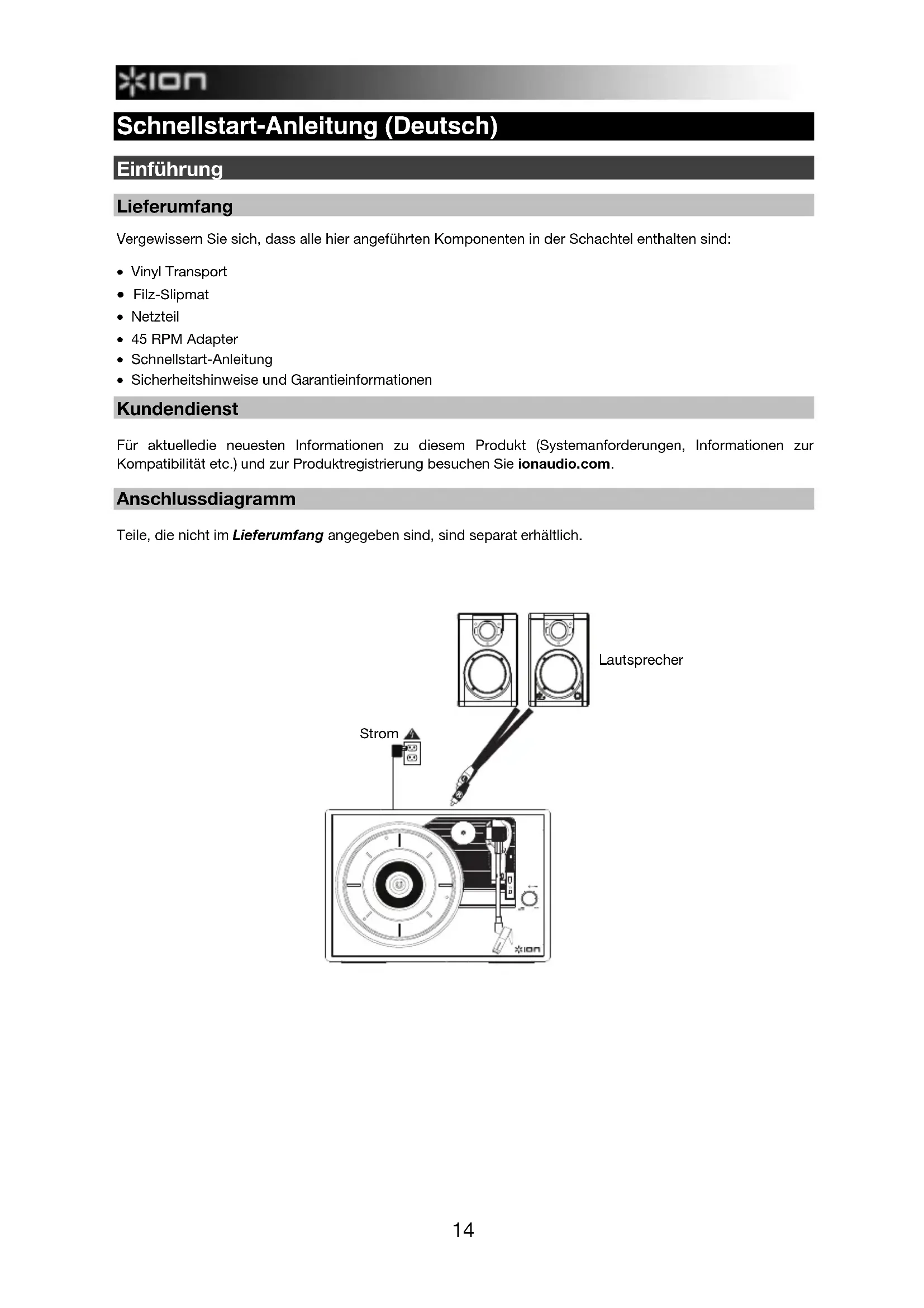 - Sicherheitshinweise und Garantieinformationen Kundendienst Für aktuelledie neuesten Informationen zu diesem Produkt (Systemanforderungen, Informationen zur Kompatibilität etc.) und zur Produktregistrierung besuchen Sie ionaudio.com. Anschlussdiagramm Teile, die nicht im Lieferumfang angegeben sind, sind separat erhältlich.