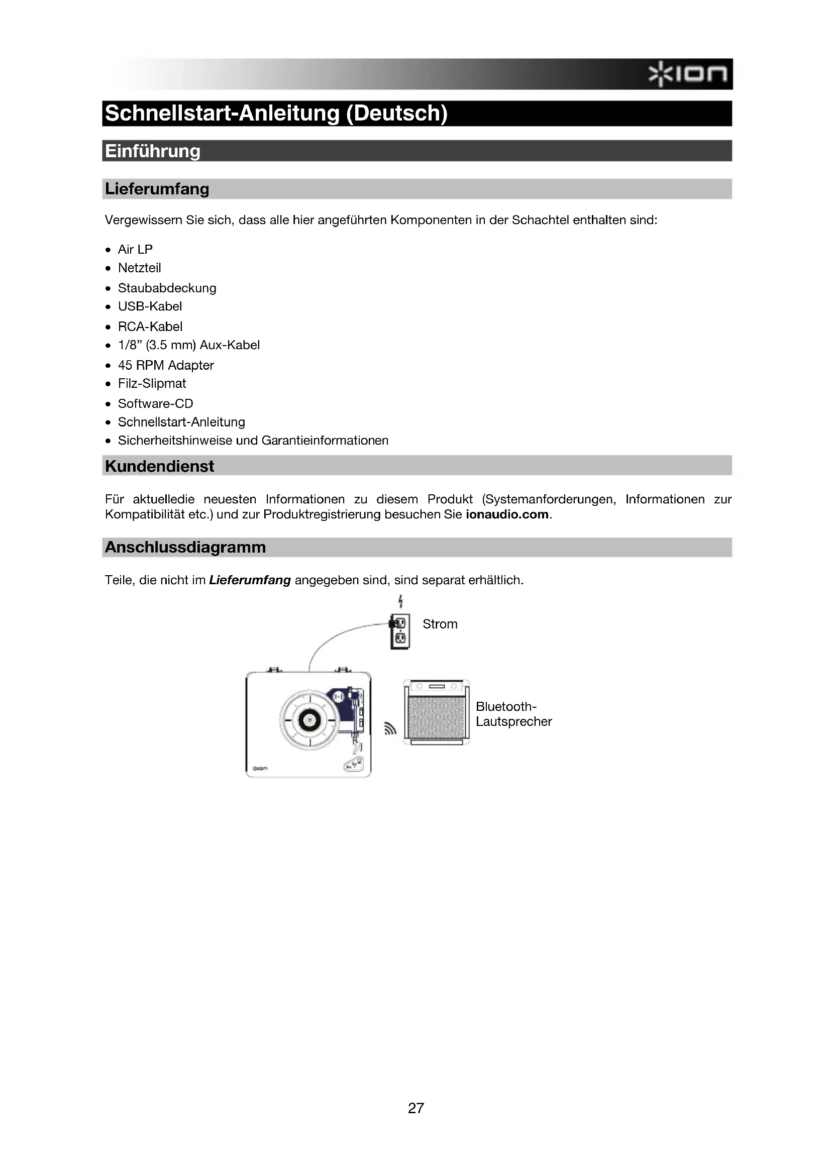 - Sicherheitshinweise und Garantieinformationen Kundendienst Für aktuelledie neuesten Informationen zu diesem Produkt (Systemanforderungen, Informationen zur Kompatibilität etc.) und zur Produktregistrierung besuchen Sie ionaudio.com. Anschlussdiagramm Teile, die nicht im Lieferumfang angegeben sind, sind separat erhältlich.