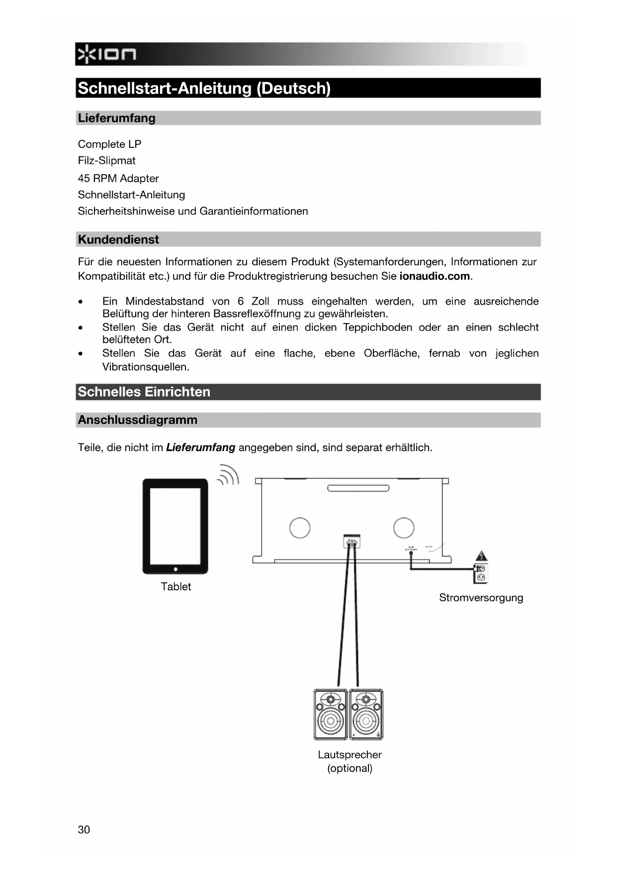 - La portata del Bluetooth è influenzata da pareti, ostacoli e movimento. Per ottenere prestazioni ottimali, collocare il prodotto al centro della stanza in modo che non sia ostacolato da pareti, mobili, ecc.30 FM ANT Schnellstart-Anleitung (Deutsch) Lieferumfang Complete LP Filz-Slipmat 45 RPM Adapter Schnellstart-Anleitung Sicherheitshinweise und Garantieinformationen Kundendienst Für die neuesten Informationen zu diesem Produkt (Systemanforderungen, Informationen zur Kompatibilität etc.) und für die Produktregistrierung besuchen Sie ionaudio.com.