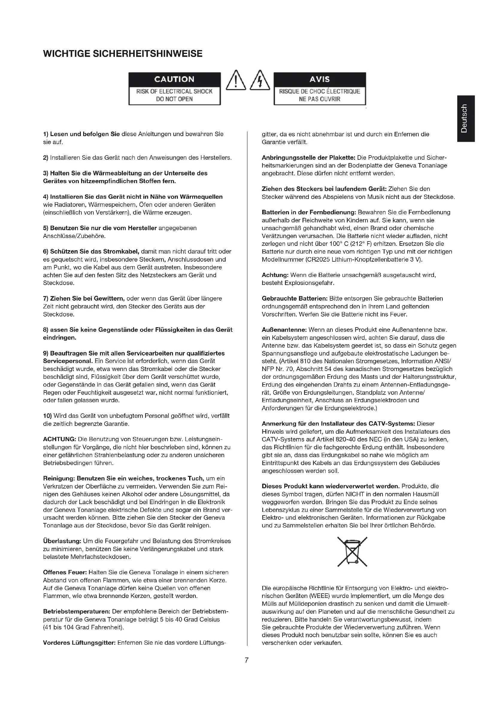 die zeitlich begrenzte Garantie. ACHTUNG: Die Benutzung von Steuerungen bzw. Leistungsein- stellungen für Vorgänge, die nicht hier beschrieben sind, können zu einer gefährlichen Strahlenbelastung oder zu anderen unsicheren Betriebsbedingen führen. Reinigung: Benutzen Sie ein weiches, trockenes Tuch, um ein Verkratzen der Oberfläche zu vermeiden. Verwenden Sie zum Rei- nigen des Gehäuses keinen Alkohol oder andere Lösungsmittel, da dadurch der Lack beschädigt und bei Eindringen in die Elektronik der Geneva Tonanlage elektrische Defekte und sogar ein Brand ver- ursacht werden können. Bitte ziehen Sie den Stecker der Geneva Tonanlage aus der Steckdose, bevor Sie das Gerät reinigen. Überlastung: Um die Feuergefahr und Belastung des Stromkreises zu minimieren, benützen Sie keine Verlängerungskabel und stark belastete Mehrfachsteckdosen. Offenes Feuer: Halten Sie die Geneva Tonalage in einem sicheren Abstand von offenen Flammen, wie etwa einer brennenden Kerze. Auf die Geneva Tonanlage dürfen keine Quellen von offenen Flammen, wie etwa brennende Kerzen, gestellt werden. Betriebstemperaturen: Der empfohlene Bereich der Betriebstem- peratur für die Geneva Tonanlage beträgt 5 bis 40 Grad Celsius (41 bis 104 Grad Fahrenheit). Vorderes Lüftungsgitter: Enfernen Sie nie das vordere Lüftungs-8