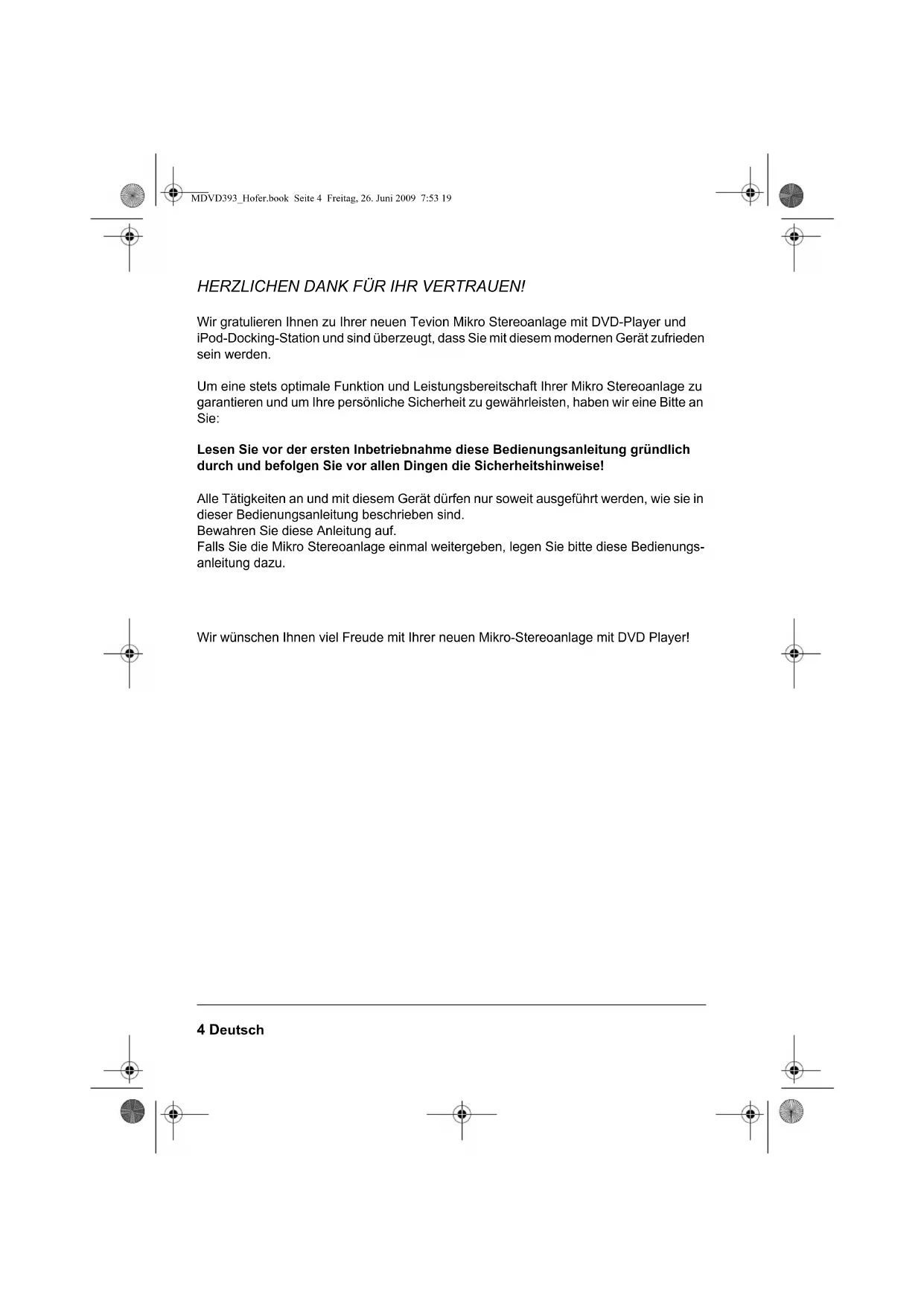 17. Technische Daten ................................................................................................. 46 18. Entsorgen .............................................................................................................. 47 MDVD393_Hofer.book Seite 3 Freitag, 26. Juni 2009 7:53 194 Deutsch HERZLICHEN DANK FÜR IHR VERTRAUEN! Wir gratulieren Ihnen zu Ihrer neuen Tevion Mikro Stereoanlage mit DVD-Player und iPod-Docking-Station und sind überzeugt, dass Sie mit diesem modernen Gerät zufrieden sein werden. Um eine stets optimale Funktion und Leistungsbereitschaft Ihrer Mikro Stereoanlage zu garantieren und um Ihre persönliche Sicherheit zu gewährleisten, haben wir eine Bitte an Sie: Lesen Sie vor der ersten Inbetriebnahme diese Bedienungsanleitung gründlich durch und befolgen Sie vor allen Dingen die Sicherheitshinweise! Alle Tätigkeiten an und mit diesem Gerät dürfen nur soweit ausgeführt werden, wie sie in dieser Bedienungsanleitung beschrieben sind. Bewahren Sie diese Anleitung auf. Falls Sie die Mikro Stereoanlage einmal weitergeben, legen Sie bitte diese Bedienungs- anleitung dazu. Wir wünschen Ihnen viel Freude mit Ihrer neuen Mikro-Stereoanlage mit DVD Player! MDVD393_Hofer.book Seite 4 Freitag, 26. Juni 2009 7:53 19Deutsch 5