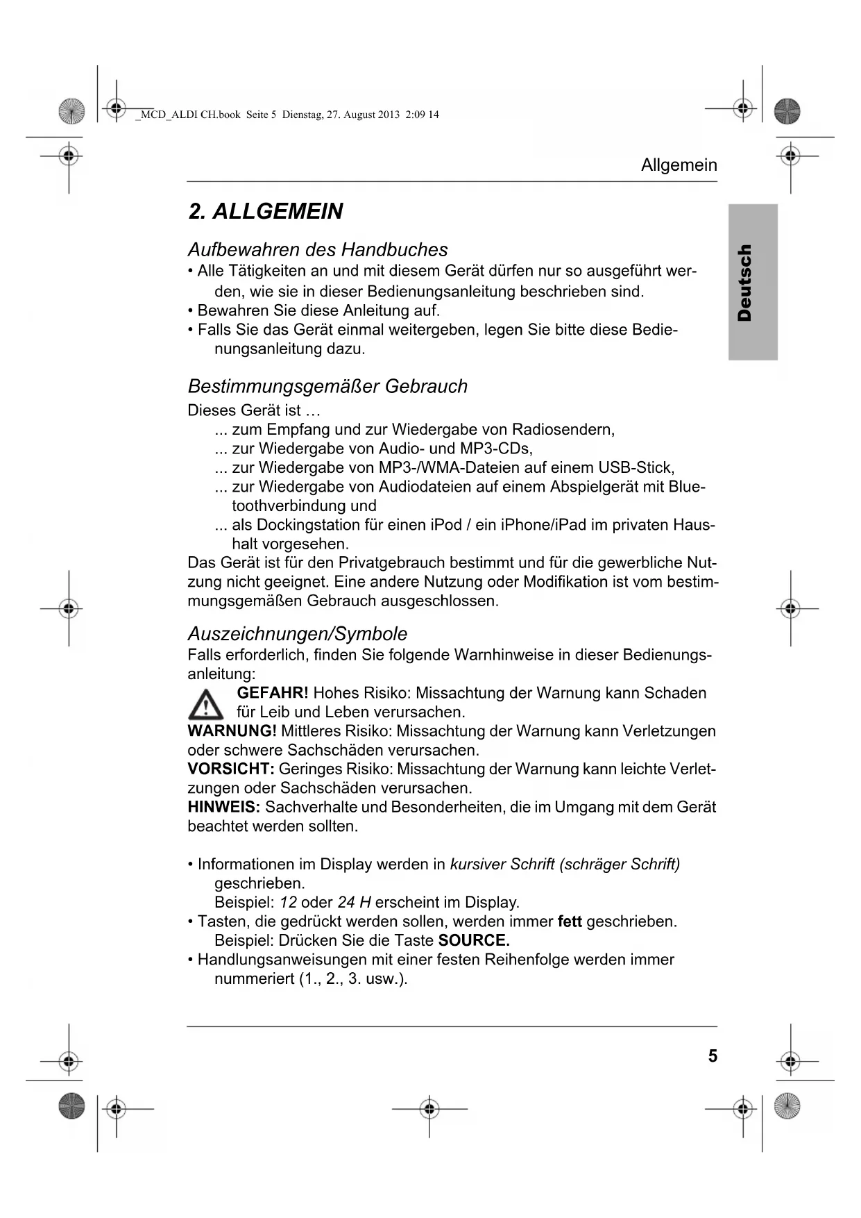 - Handlungsanweisungen mit einer festen Reihenfolge werden immer nummeriert (1., 2., 3. usw.). _MCD_ALDI CH.book Seite 5 Dienstag, 27. August 2013 2:09 146 Sicherheitshinweise