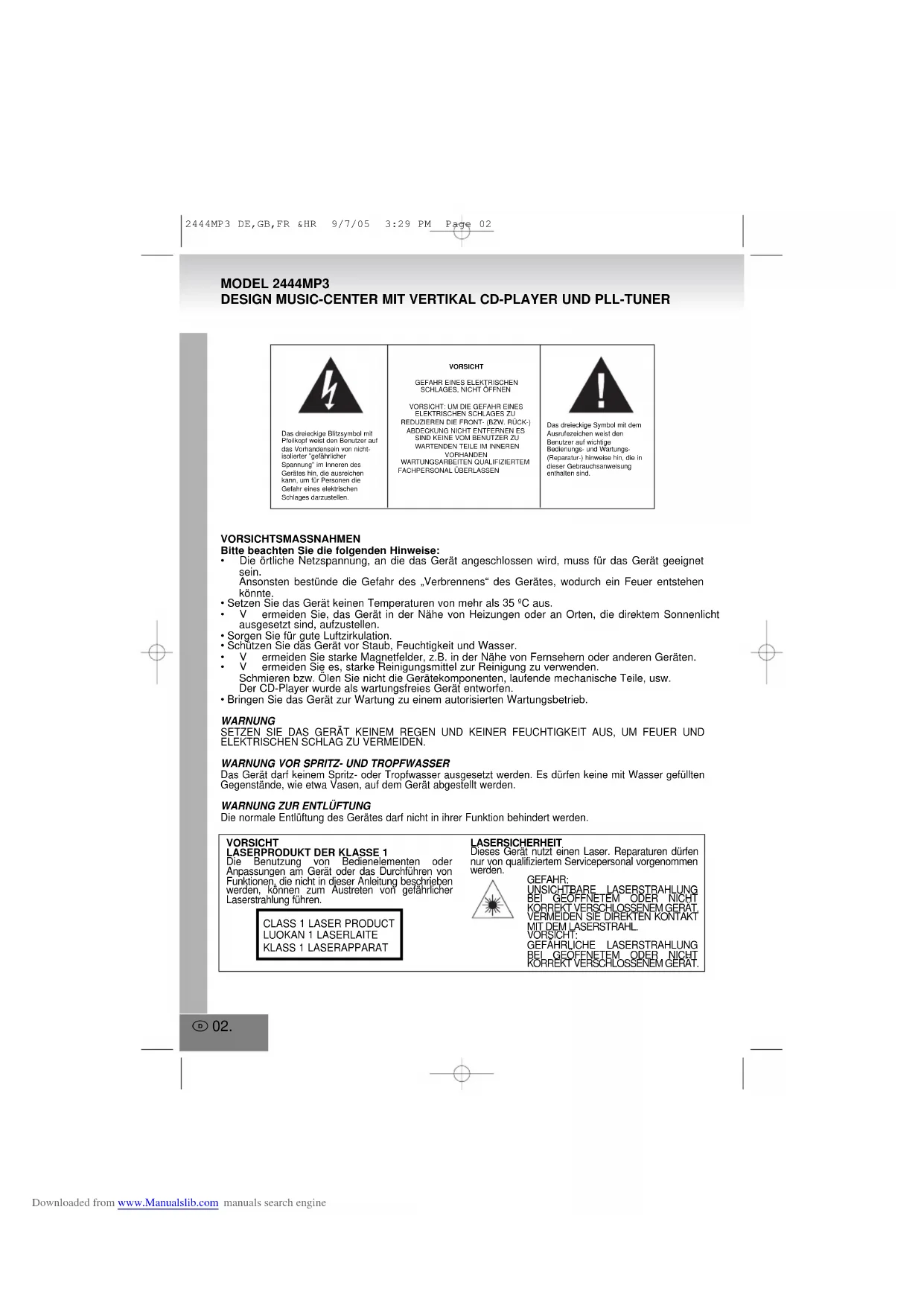 2444MP3 Cover 9/7/05 3:26 PM Page 3 Downloaded from www.Manualslib.com manuals search engineVORSICHTSMASSNAHMENBitte beachten Sie die folgenden Hinweise: