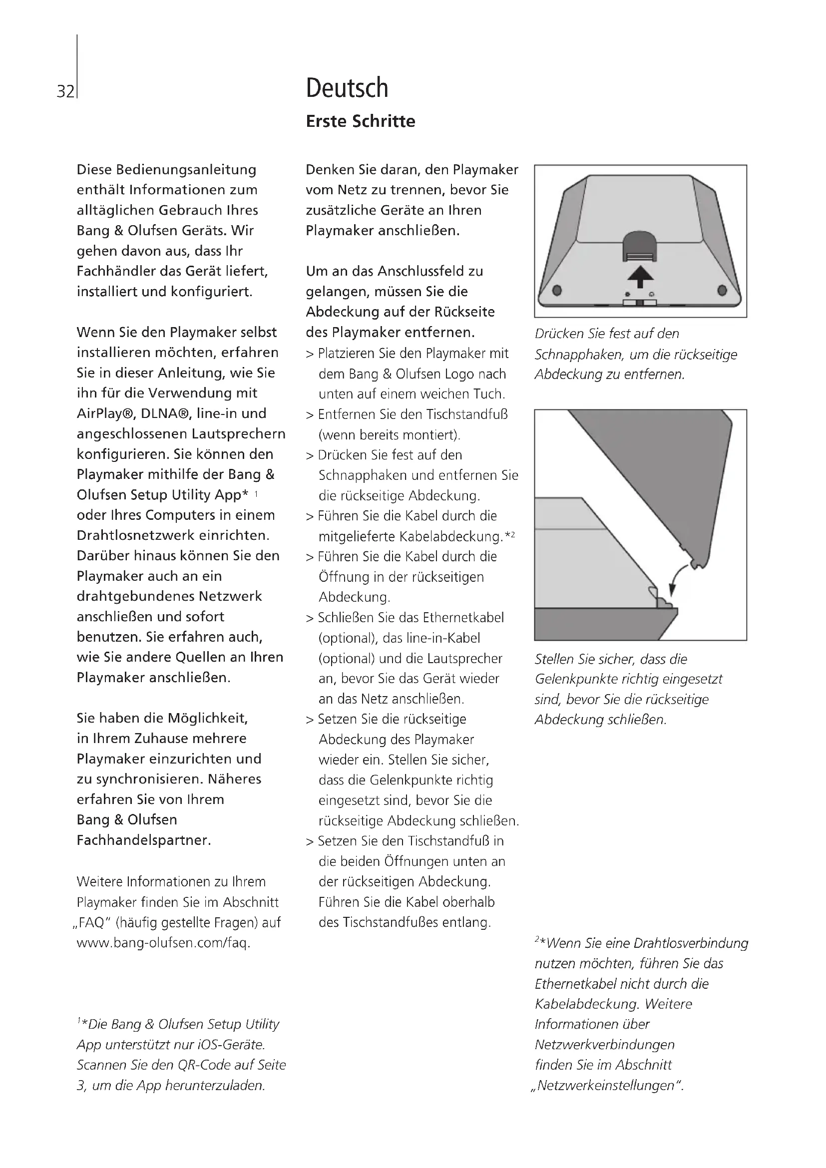 oder Ihres Computers in einem Drahtlosnetzwerk einrichten. Darüber hinaus können Sie den Playmaker auch an ein drahtgebundenes Netzwerk anschließen und sofort benutzen. Sie erfahren auch, wie Sie andere Quellen an Ihren Playmaker anschließen. Sie haben die Möglichkeit, in Ihrem Zuhause mehrere Playmaker einzurichten und zu synchronisieren. Näheres erfahren Sie von Ihrem Bang&Olufsen Fachhandelspartner. Weitere Informationen zu Ihrem Playmaker nden Sie im Abschnitt „FAQ“ (häug gestellte Fragen) auf www.bang-olufsen.com/faq. Denken Sie daran, den Playmaker vom Netz zu trennen, bevor Sie zusätzliche Geräte an Ihren Playmaker anschließen. Um an das Anschlussfeld zu gelangen, müssen Sie die Abdeckung auf der Rückseite des Playmaker entfernen. > Platzieren Sie den Playmaker mit dem Bang& Olufsen Logo nach unten auf einem weichen Tuch. > Entfernen Sie den Tischstandfuß (wenn bereits montiert). > Drücken Sie fest auf den Schnapphaken und entfernen Sie die rückseitige Abdeckung. > Führen Sie die Kabel durch die mitgelieferte Kabelabdeckung.*