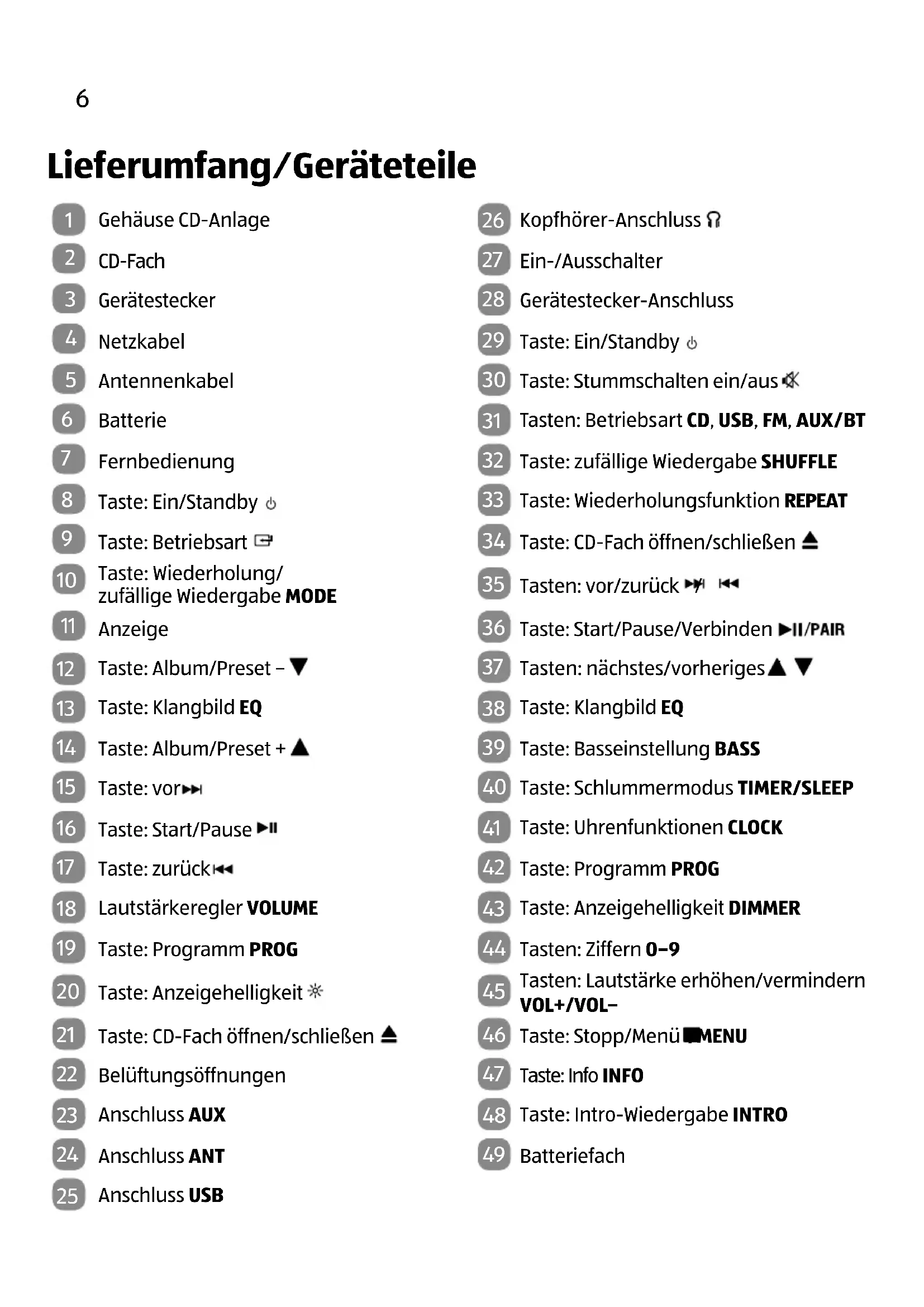 − Bei Reparaturen dürfen nur Teile verwendet werden, die den ursprünglichen Gerätedaten entsprechen. In dieser Mikroan- lage befinden sich elektrische und mechanische Teile, die zum Schutz gegen Gefahrenquellen unerlässlich sind. − Verwenden Sie für den Betrieb der Mikroanlage ausschließlich das im Lieferumfang enthaltene oder durch den Hersteller spezifizierte Zubehör. − Halten Sie Feuchtigkeit von der Mikroanlage, dem Netzkabel, dem Netzstecker und der Fernbedienung fern. Schützen Sie die Mikroanlage vor Tropf- und Spritzwasser und stellen Sie keine mit Flüssigkeit gefüllten Gegenstände, wie z.B. Vasen, auf die Mikroanlage. − Tauchen Sie weder die Mikroanlage noch Netzkabel oder Netzste cker in Wasser oder andere Flüssigkeiten. − Fassen Sie den Netz stecker niemals mit feuchten Händen an. − Ziehen Sie den Netzstecker nie am Netzkabel aus der Steck- dose, sondern fassen Sie immer den Netzstecker an. − Verwenden Sie das Netzkabel nie als Tragegriff. − Halten Sie die Mikroanlage, den Netzstecker und das Netz- kabel von offenem Feuer und heißen Flächen fern. − Stellen Sie keine offenen Brandquellen, wie z. B. eine bren- nende Kerze, auf die Mikroanlage. − Stellen Sie die Mikroanlage so auf, dass ein Mindestabstand von 5 cm zu anderen Gegenständen oder zu Wänden vorhan- den ist. − Stellen Sie sicher, dass eine ausreichende Belüftung der Mikroanlage gewährleistet wird. Halten Sie die Belüftungs- öffnungen an der Rückseite der Mikroanlage offen. Stellen Sie sicher, dass die Belüftungsöffnungen an der Rückseite der Mikroanlage nicht durch Zeitschriften, Tischdecken, Vorhänge o.Ä. abgedeckt sind. − Verlegen Sie das Netzkabel so, dass es nicht zur Stolperfalle wird. − Knicken Sie das Netzkabel nicht und legen Sie es nicht über scharfe Kanten.Sicherheit