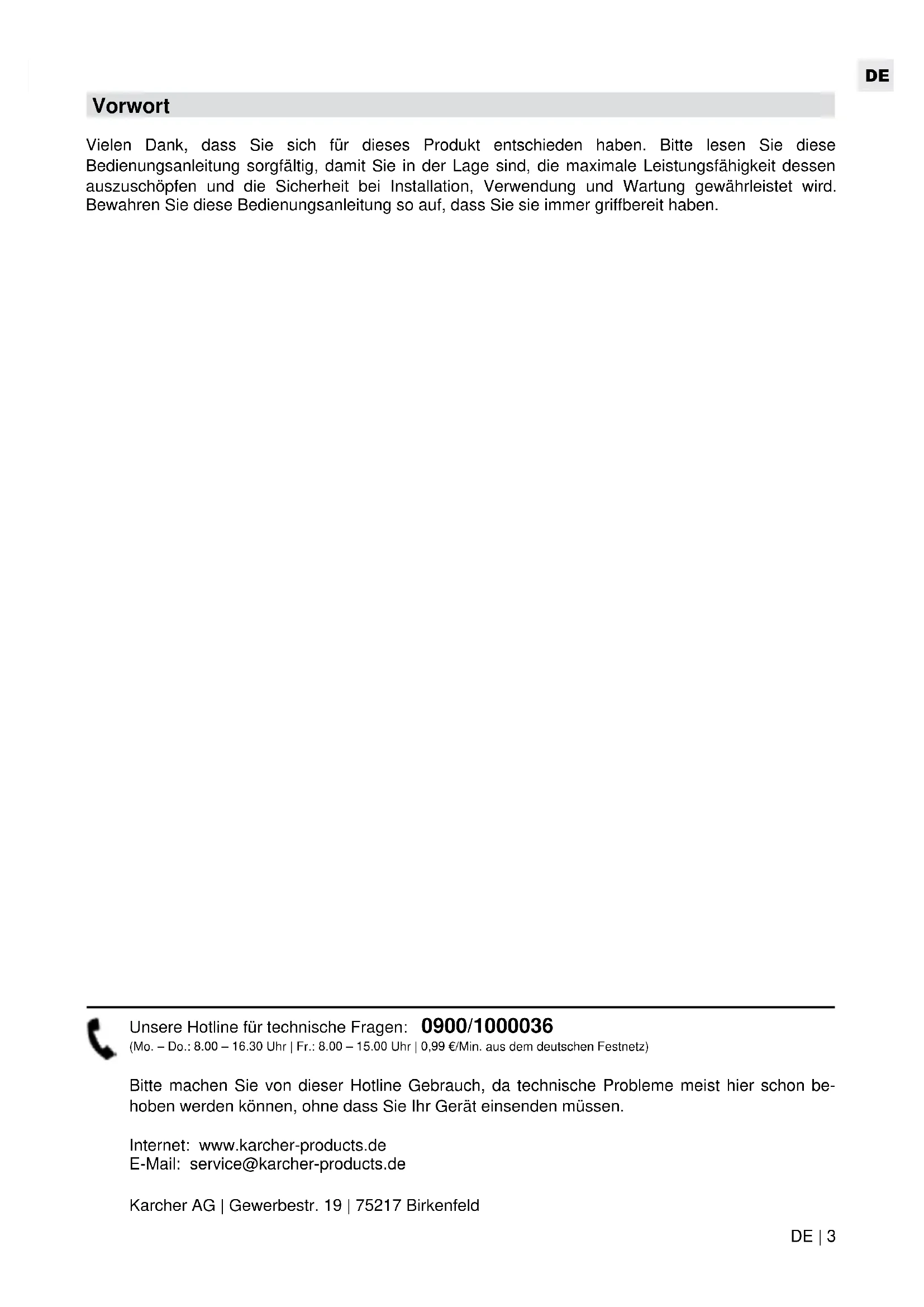 Vorwort Vielen Dank, dass Sie sich für dieses Produkt entschieden haben. Bitte lesen Sie diese Bedienungsanleitung sorgfältig, damit Sie in der Lage sind, die maximale Leistungsfähigkeit dessen auszuschöpfen und die Sicherheit bei Installation, Verwendung und Wartung gewährleistet wird. Bewahren Sie diese Bedienungsanleitung so auf, dass Sie sie immer griffbereit haben. Unsere Hotline für technische Fragen: 0900/1000036 (Mo. – Do.: 8.00 – 16.30 Uhr | Fr.: 8.00 – 15.00 Uhr | 0,99 €/Min. aus dem deutschen Festnetz) Bitte machen Sie von dieser Hotline Gebrauch, da technische Probleme meist hier schon be- hoben werden können, ohne dass Sie Ihr Gerät einsenden müssen. Internet: www.karcher-products.de E-Mail: service@karcher-products.de Karcher AG | Gewerbestr. 19 | 75217 Birkenfeld4 | DE Sicherheitshinweise