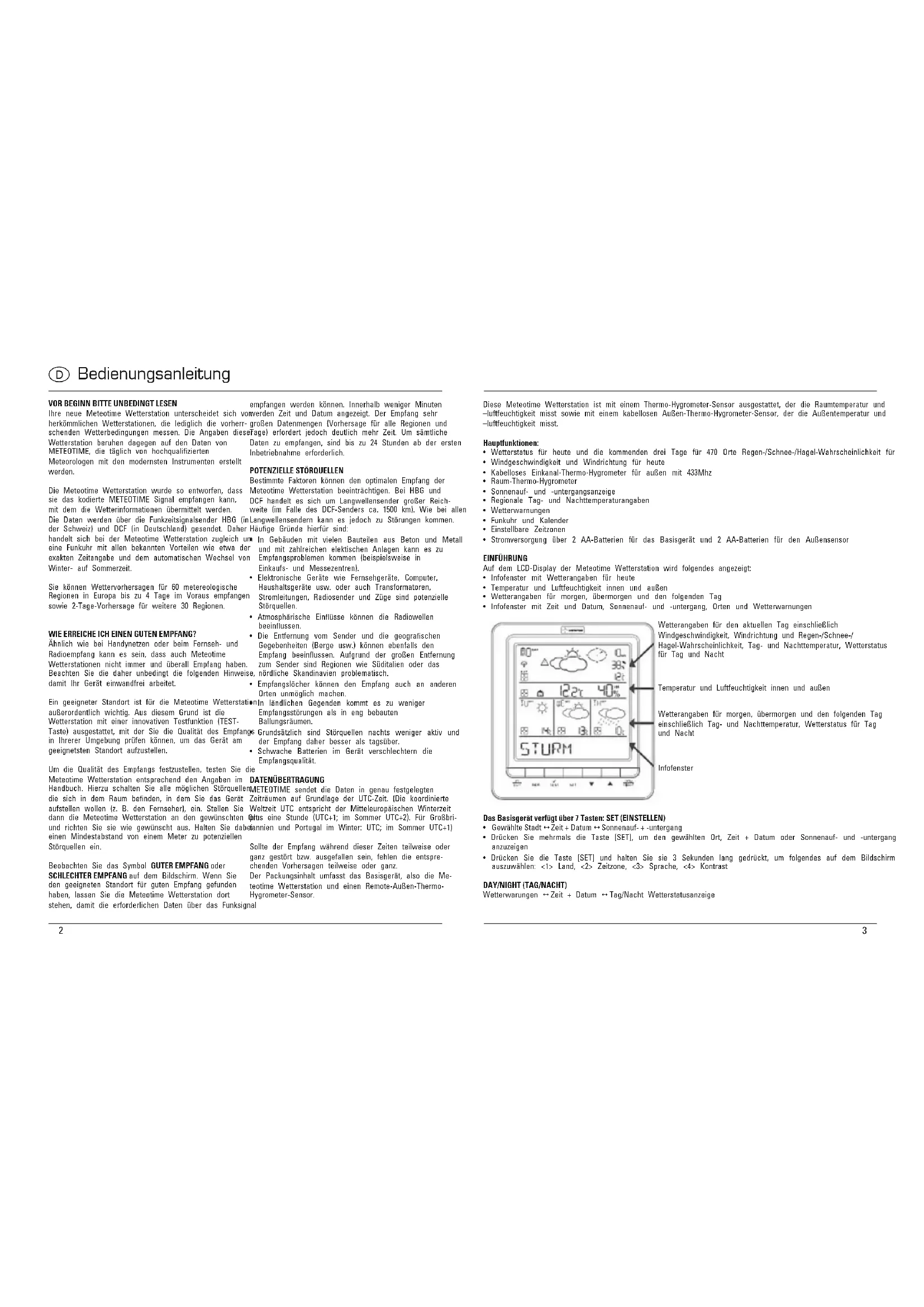 Ihre neue Meteotime Wetterstation unterscheidet sich von herkömmlichen Wetterstationen, die lediglich die vorherr- schenden Wetterbedingungen messen. Die Angaben dieser Wetterstation beruhen dagegen auf den Daten von METEOTIME, die täglich von hochqualizierten Meteorologen mit den modernsten Instrumenten erstellt werden. Die Meteotime Wetterstation wurde so entworfen, dass sie das kodierte METEOTIME Signal empfangen kann, mit dem die Wetterinformationen übermittelt werden. Die Daten werden über die Funkzeitsignalsender HBG (in der Schweiz) und DCF (in Deutschland) gesendet. Daher handelt sich bei der Meteotime Wetterstation zugleich um eine Funkuhr mit allen bekannten Vorteilen wie etwa der exakten Zeitangabe und dem automatischen Wechsel von Winter- auf Sommerzeit. Sie können Wettervorhersagen für 60 metereologische Regionen in Europa bis zu 4 Tage im Voraus empfangen sowie 2-Tage-Vorhersage für weitere 30 Regionen. WIE ERREICHE ICH EINEN GUTEN EMPFANG? Ähnlich wie bei Handynetzen oder beim Fernseh- und Radioempfang kann es sein, dass auch Meteotime Wetterstationen nicht immer und überall Empfang haben. Beachten Sie die daher unbedingt die folgenden Hinweise, damit Ihr Gerät einwandfrei arbeitet. Ein geeigneter Standort ist für die Meteotime Wetterstation außerordentlich wichtig. Aus diesem Grund ist die Wetterstation mit einer innovativen Testfunktion (TEST- Taste) ausgestattet, mit der Sie die Qualität des Empfangs in Ihrerer Umgebung prüfen können, um das Gerät am geeignetsten Standort aufzustellen. Um die Qualität des Empfangs festzustellen, testen Sie die Meteotime Wetterstation entsprechend den Angaben im Handbuch. Hierzu schalten Sie alle möglichen Störquellen, die sich in dem Raum benden, in dem Sie das Gerät aufstellen wollen (z. B. den Fernseher), ein. Stellen Sie dann die Meteotime Wetterstation an den gewünschten Ort und richten Sie sie wie gewünscht aus. Halten Sie dabei einen Mindestabstand von einem Meter zu potenziellen Störquellen ein. Beobachten Sie das Symbol GUTER EMPFANG oder SCHLECHTER EMPFANG auf dem Bildschirm. Wenn Sie den geeigneten Standort für guten Empfang gefunden haben, lassen Sie die Meteotime Wetterstation dort stehen, damit die erforderlichen Daten über das Funksignal empfangen werden können. Innerhalb weniger Minuten werden Zeit und Datum angezeigt. Der Empfang sehr großen Datenmengen (Vorhersage für alle Regionen und Tage) erfordert jedoch deutlich mehr Zeit. Um sämtliche Daten zu empfangen, sind bis zu 24 Stunden ab der ersten Inbetriebnahme erforderlich.