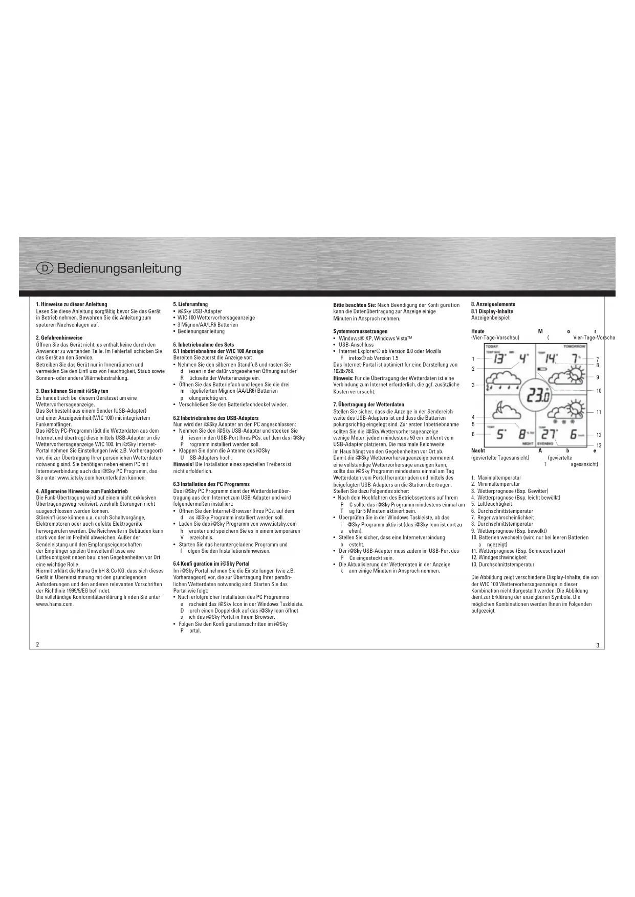 Sicherheitshinweis Der Hersteller bzw. Verkäufer dieser Wetterstation über- nimmt keine Verantwortung für inkorrekte Werte und die Folgen, die sich daraus ergeben können. Der Hersteller bzw. Verkäufer hat keinen Einfl uss auf die übertragenen Wetterdaten und -prognosen. Die Wetterdaten werden von Weather365.net bereitgestellt. Der Hersteller über- nimmt keine Gewähr für die ununterbrochene Verfügbarkeit und Richtigkeit von Daten. Eine Haftung für technisch bedingte Ausfälle, Unterbrechungen, fehlende oder fehlerhafte Datenübertragungen oder sonstige Probleme im Zusammenhang mit der Datenübermittlung von Daten sowie deren Folgen, ist ausgeschlossen. 00092621bda.indd Abs2:4-Abs2:500092621bda.indd Abs2:4-Abs2:5 04.09.2008 16:09:57 Uhr04.09.2008 16:09:57 Uhr6