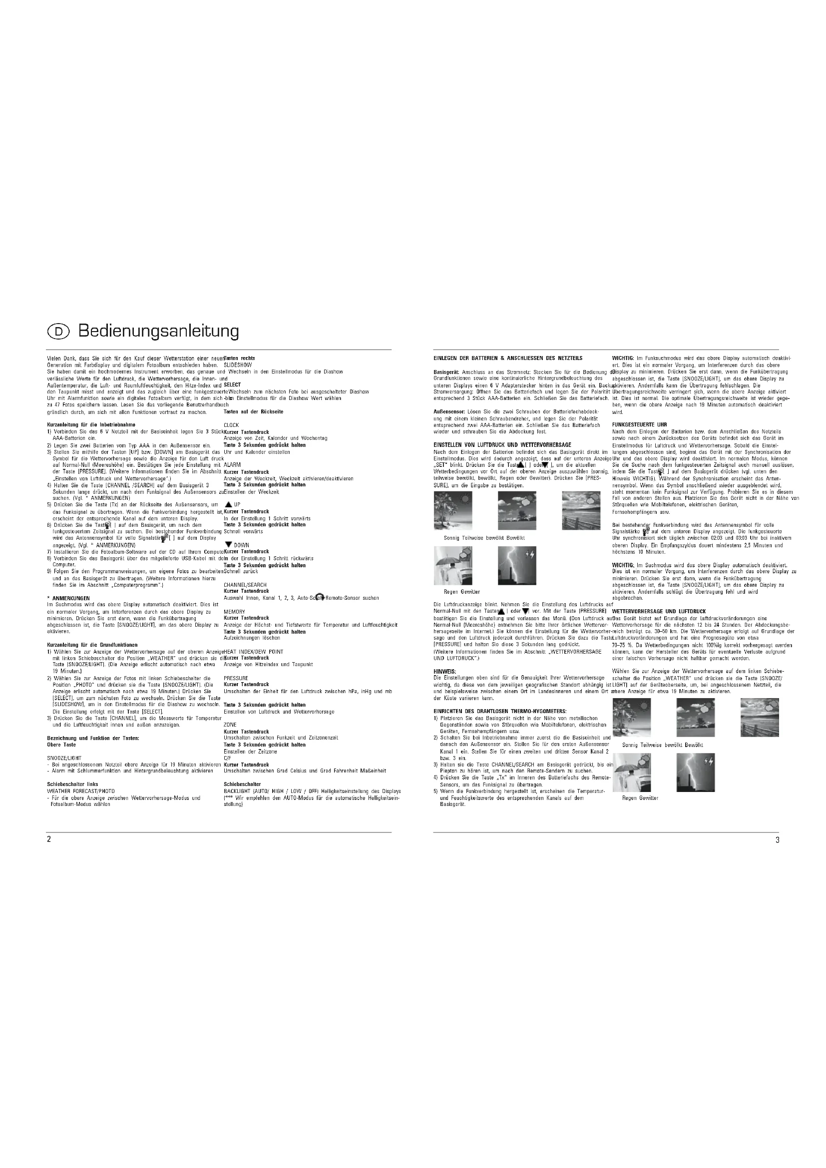 d Bedienungsanleitung Vielen Dank, dass Sie sich für den Kauf dieser Wetterstation einer neuen Generation mit Farbdisplay und digitalem Fotoalbum entschieden haben. Sie haben damit ein hochmodernes Instrument erworben, das genaue und verlässliche Werte für den Luftdruck, die Wettervorhersage, die Innen- und Außentemperatur, die Luft- und Raumluftfeuchtigkeit, den Hitze-Index und den Taupunkt misst und anzeigt und das zugleich über eine funkgesteuerte Uhr mit Alarmfunktion sowie ein digitales Fotoalbum verfügt, in dem sich bis zu 47 Fotos speichern lassen. Lesen Sie das vorliegende Benutzerhandbuch gründlich durch, um sich mit allen Funktionen vertraut zu machen. Kurzanleitung für die Inbetriebnahme
