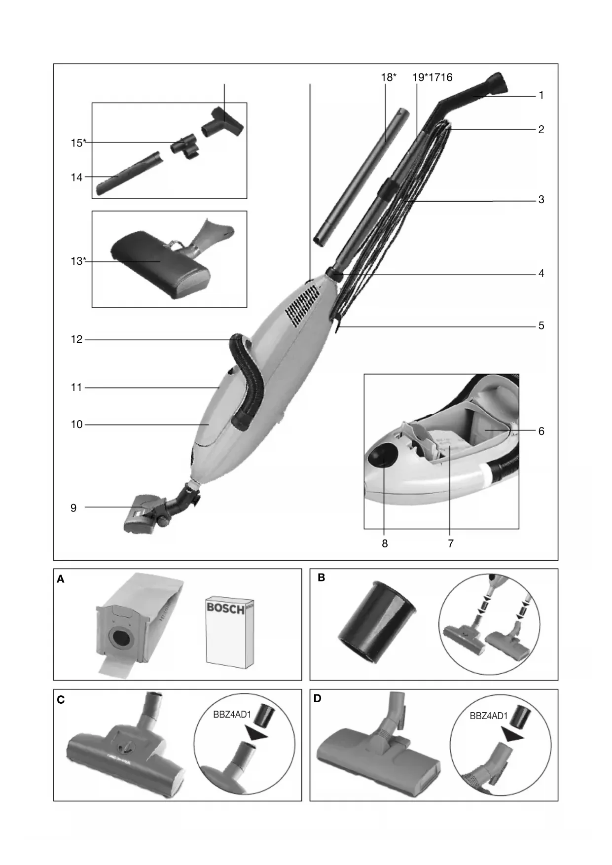 je nach Ausstattung Ersatzteile und Sonderzubehör A Ersatzfilterpackung BHZ4AF1/Typ S Inhalt: 8 Filterbeutel mit Verschluss 1 Micro-Hygienefilter B Adapter für Sonderdüsen BBZ4AD1 Wird für BBZ102TBB und BBZ103WD benötigt. C TURBO-UNIVERSAL
