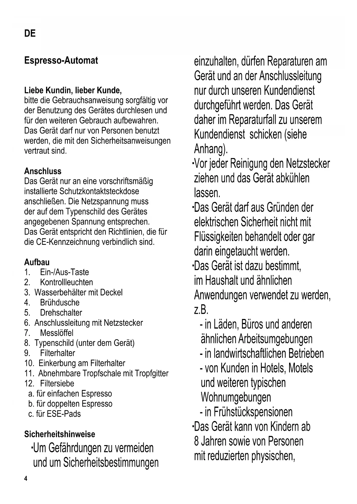 ∙ Nach ca. 30 Sek. den Filterhalter entnehmen und den Espressosatz entleeren. ∙ Bei Bedarf können jetzt weitere Tassen zubereitet werden. Reinigung und Pfl ege ∙ Vor der Reinigung den Netzstecker ziehen und den Espresso-Automaten abkühlen lassen. ∙ Das Gerät darf aus Gründen der elektrischen Sicherheit nicht mit Wasser behandelt oder gar darin eingetaucht werden.9 ∙ Keine scharfen oder scheuernden Reinigungsmittel verwenden. ∙ Alle abnehmbaren Teile können im Spülwasser gereinigt werden. Nicht in der Spülmaschine reinigen! ∙ Tropfschale täglich entleeren und zusammen mit dem Tropfgitter im Spülwasser reinigen. ∙ Das Gehäuse außen mit einem trockenen oder nur leicht angefeuchteten Tuch reinigen. ∙ Die Brühdusche mit einem angefeuchteten Tuch abwischen. ∙ Den Dichtungsbereich der Brühdusche (beim Bajonettverschluss) mit einem Pinsel reinigen. Der Pinsel sollte harte Borsten besitzen. ∙ Wasserbehälter täglich leeren und regelmäßig im Spülwasser reinigen. Entkalkung Je nach Kalkgehalt des Wassers und der Benutzungshäufi gkeit, müssen Heißwassergeräte regelmäßig entkalkt werden. Der Garantieanspruch erlischt bei Geräten, die aufgrund mangelnder Entkalkung nicht einwandfrei funktionieren. Hierzu eignen sich handelsübliche Kaffeeautomaten-Entkalkungsmittel. ∙ Entkalkungsmittellösung in den Wasserbehälter füllen. ∙ Wie bei der Espresso-Zubereitung beschrieben, aber ohne Espressomehl und mit herausgenommenem Filtersieb, tassenweise diese Mischung durchkochen lassen. Zwischen jeder Tasse eine Pause von ca. 5 Minuten einhalten, damit das Entkalkungsmittel einwirken kann. ∙ Anschließend 2 Wasserbehälterfüllungen mit klarem Wasser durchkochen, damit das Entkalkungsmittel vollständig ausgespült wird. ∙ Filterhalter mit Wasser abspülen. ∙ Entkalkungsmittel nicht in emaillierte Abfl ussbecken gießen. Ersatzteile und Zubehör Ersatzteile oder Zubehör können bequem im Internet auf unserer Homepage http://www. severin.de unter dem Unterpunkt „Service / Ersatzteil-Shop“ bestellt werden. Entsorgung Geräte, die mit diesem Symbol gekennzeichnet sind, müssen getrennt vom Hausmüll entsorgt werden. Diese Geräte enthalten wertvolle Rohstoffe, die wiederverwertet werden können. Eine ordnungsgemäße Entsorgung schützt die Umwelt und die Gesundheit Ihrer Mitmenschen. Ihre Gemeindeverwaltung bzw. Ihr Fachhändler gibt Auskunft über die ordnungsgemäße Entsorgung. Garantie SEVERIN gewährt eine Herstellergarantie von zwei Jahren ab Kaufdatum. In diesem Zeitraum beseitigen wir kostenlos alle Mängel, die nachweislich auf Material- oder Fertigungsfehlern beruhen und die Funktion wesentlich beeinträchtigen. Weitere Ansprüche sind ausgeschlossen. Von der Garantie ausgenommen sind: Schäden, die auf Nichtbeachtung der Gebrauchsanweisung, unsachgemäße Behandlung oder normalen Verschleiß zurückzuführen sind, ebenso leicht zerbrechliche Teile wie z. B. Glas, Kunststoff oder Glühlampen. Die Garantie erlischt bei10 Eingriff nicht von SEVERIN autorisierter Stellen. Sollte eine Reparatur erforderlich werden, bitte das Gerät ohne Zubehörteile, gut verpackt, mit Fehlererklärung und Kaufbeleg versehen, direkt an den SEVERIN-Service senden. Die gesetzlichen Gewährleistungsrechte gegenüber dem Verkäufer und eventuelle Verkäufergarantien bleiben unberührt.11 Espresso maker Dear Customer, Before using the appliance, please read the following instructions carefully and keep this manual for future reference. The appliance must only be used by persons familiar with these instructions. Connection to the mains supply The appliance should only be connected to an earthed socket installed in accordance with the regulations. Make sure that the supply voltage corresponds with the voltage marked on the rating label. This product complies with all binding CE labelling directives. Familiarisation