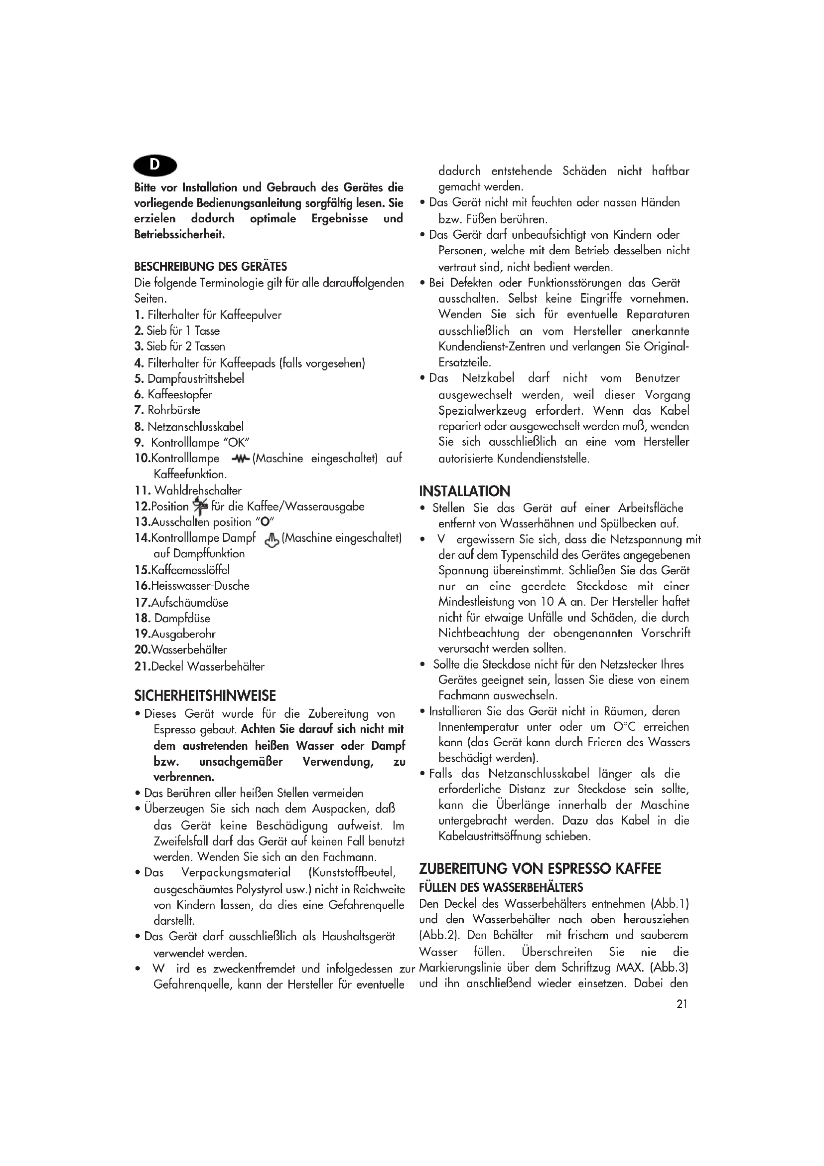 - Dieses Gerät wurde für die Zubereitung von Espresso gebaut. Achten Sie darauf sich nicht mit dem austretenden heißen Wasser oder Dampf bzw. unsachgemäßer Verwendung, zu verbrennen.