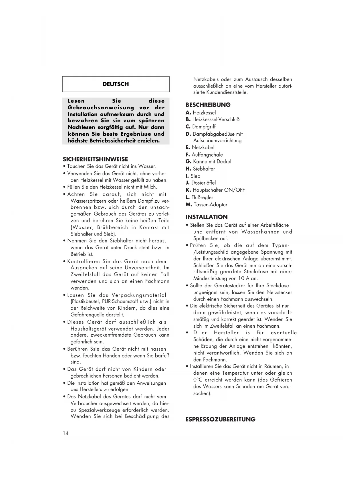 - Das Netzkabel des Gerätes darf nicht vom Verbraucher ausgewechselt werden, da hier- zu Spezialwerkzeuge erforderlich werden. Wenden Sie sich bei Beschädigung des Netzkabels oder zum Austausch desselben ausschließlich an eine vom Hersteller autori- sierte Kundendienststelle. BESCHREIBUNG A. Heizkessel B. Heizkesssel-Verschluß C. Dampfgriff D. Dampfabgabedüse mit Aufschäumvorrichtung E. Netzkabel F. Auffangschale G. Kanne mit Deckel H. Siebhalter