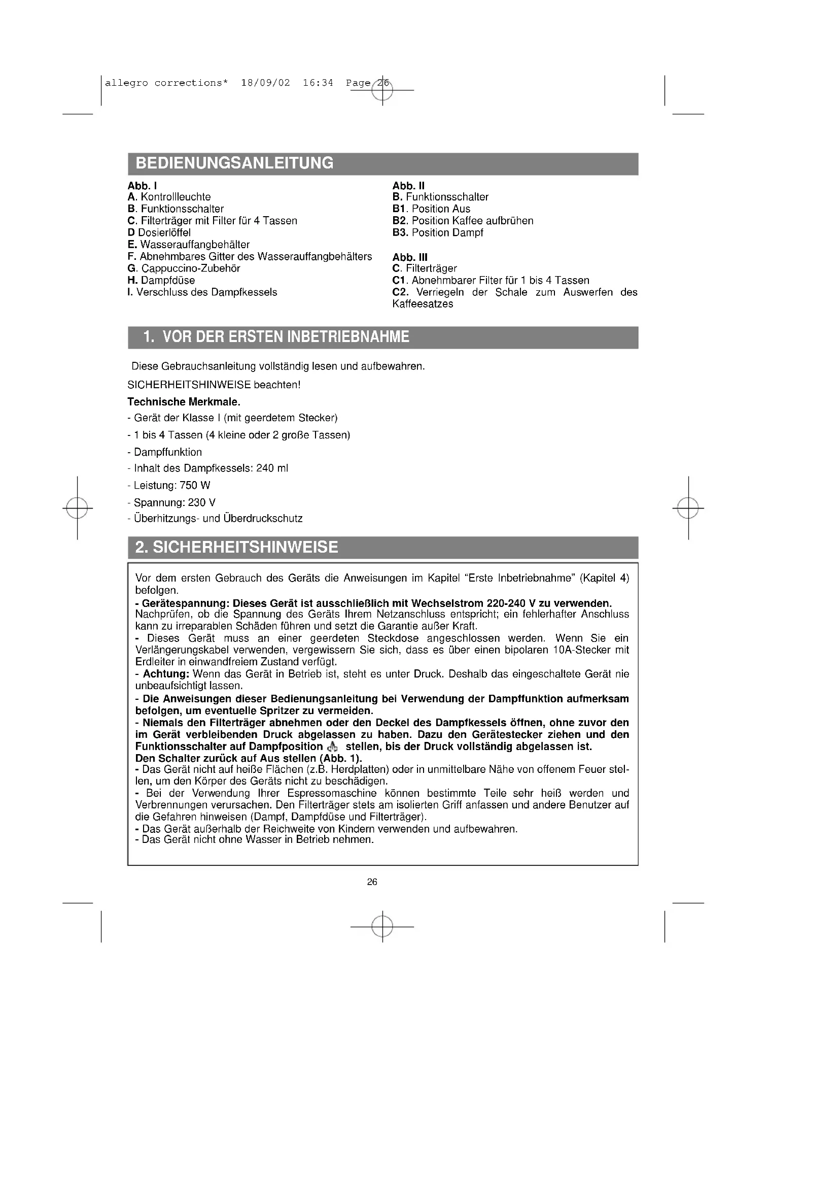 allegro corrections* 18/09/02 16:34 Page 263. PRAKTISCHE HINWEISE -Um Espresso mit intensivem Aroma zu erhalten, empfehlen wir Ihnen, frisch gemahlenen, speziellen Espresso-Kaffee zu verwenden. -Bewahren Sie den gemahlenen Kaffee im Kühlschrank auf, so bleibt sein Aroma länger frisch. - Den Filter nicht zu voll machen. Den Dosierlöffel verwenden. Überschüssiges Kaffeepulver entfernen. Wichtig! - Vor der ersten Verwendung und nach längerem Stillstand das Gerät nach den Angaben in Kapitel IV Erste Inbetriebnahme – Spülen” spülen. - Den Dampfkessel mit kaltem Wasser füllen. - Niemals den Filterträger abnehmen oder den Deckel des Dampfkessels öffnen, ohne zuvor den im Gerät verbleibenden Druck abgelassen zu haben (Kapitel 2). Überprüfen Sie, dass der Netzstecker Ihres Geräts gezogen ist.