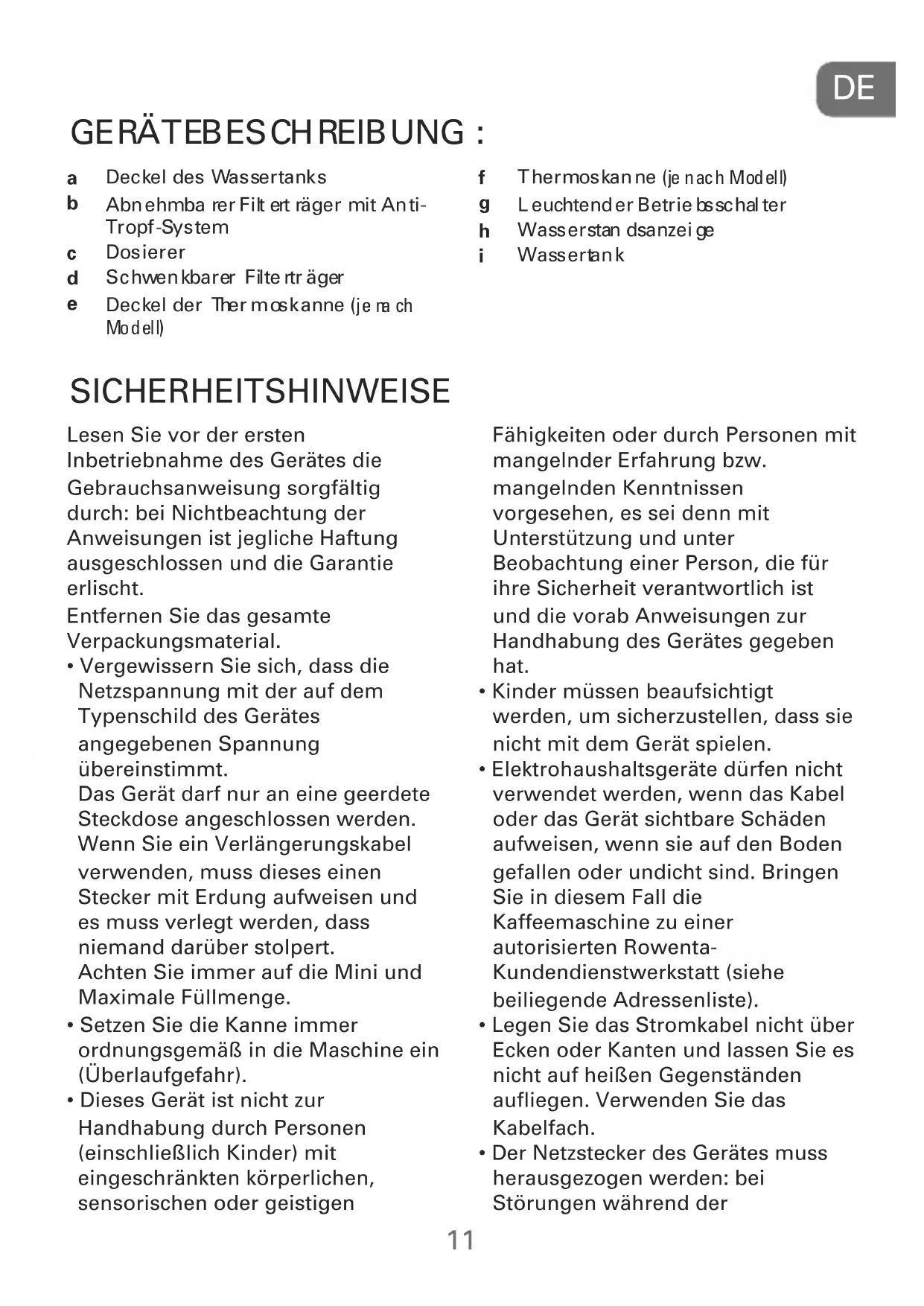 - Elektrohaushaltsgeräte durfen nicht verwendet werden, wenn das Kabel oder das Gerät sichtbare Schäden aufweisen, wenn sie auf den Boden gefallen oder undicht sind. Bringen Sie in diesem Fall die Kaffeemaschine zu einer autorisierten Rowenta- Kundendienstwerkstatt (siehe beiliegende Adressenliste).