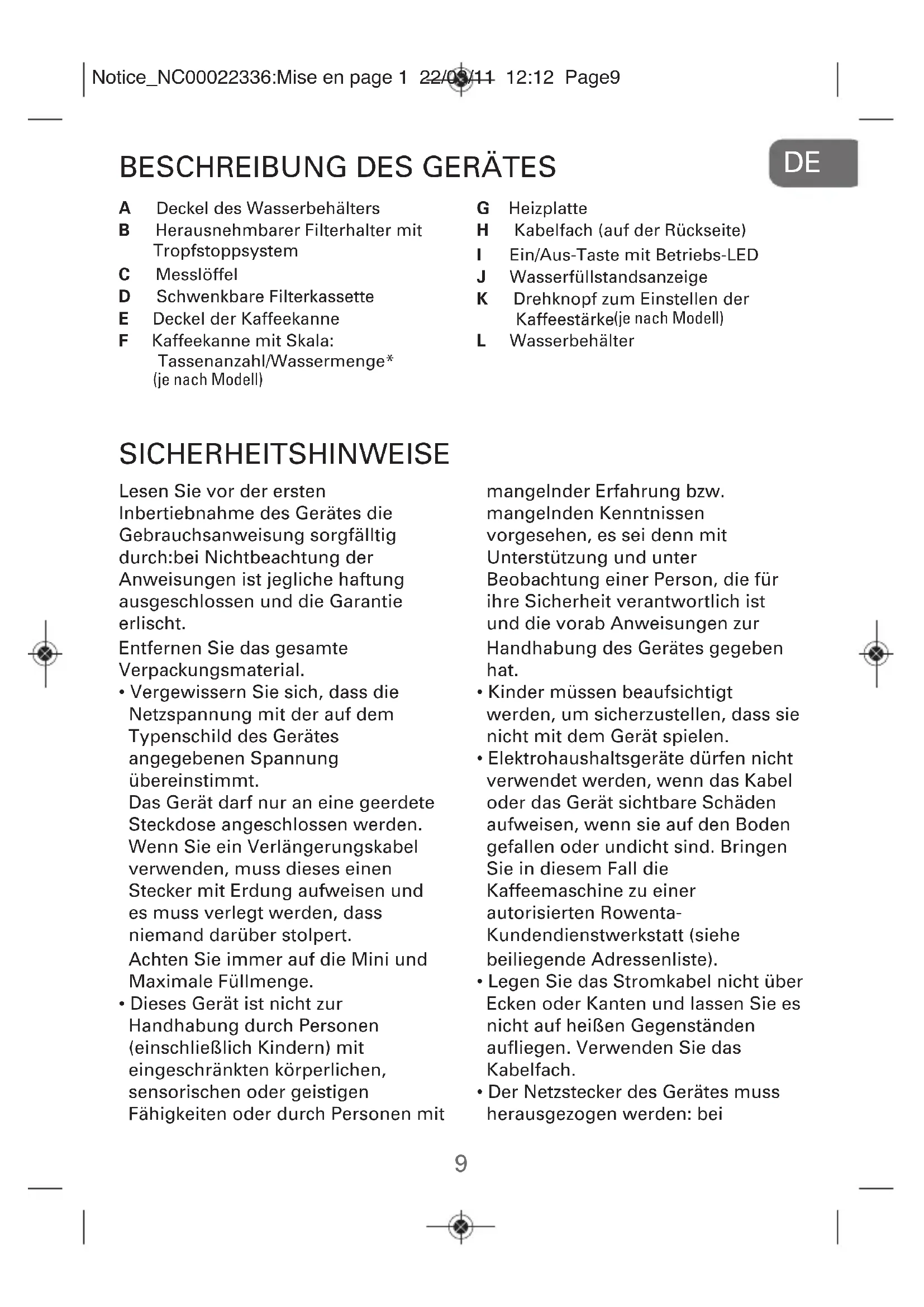 SICHERHEITSHINWEISE Notice_NC00022336:Mise en page 1 22/03/11 12:12 Page910 Gerät aufgrund einer unsachgemäßen oder nicht den Angaben der Bedienungsanleitung entsprechenden Nutzung des Gerätes.
