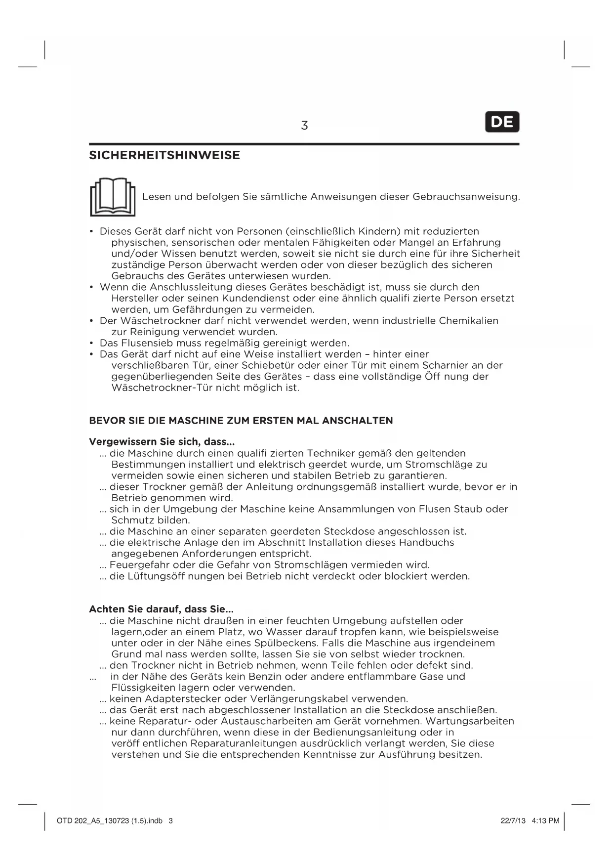 ... dieser Trockner gemäß der Anleitung ordnungsgemäß installiert wurde, bevor er in Betrieb genommen wird.