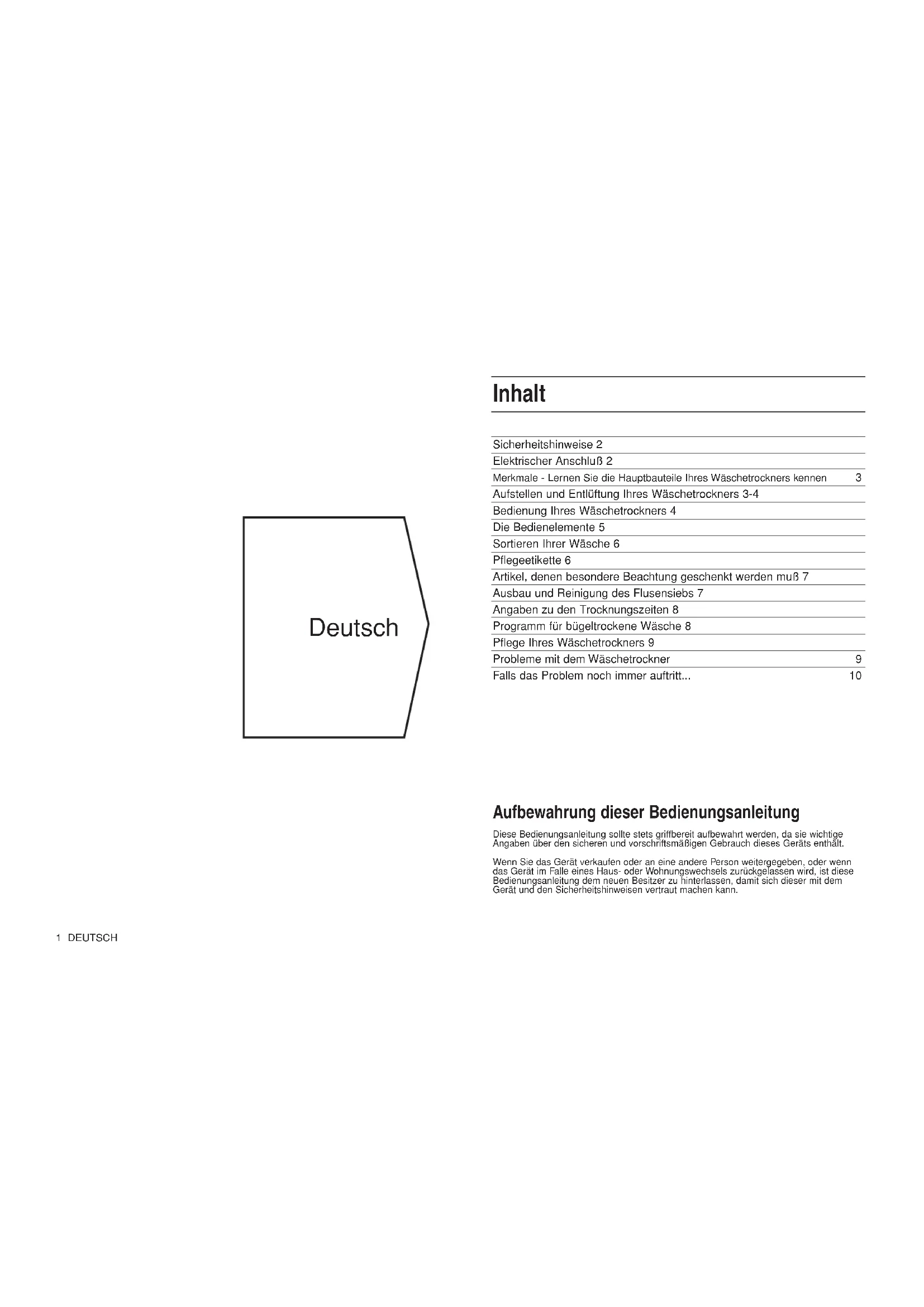 Sicherheitshinweise 2 Elektrischer Anschluß 2 Merkmale - Lernen Sie die Hauptbauteile Ihres Wäschetrockners kennen 3 Aufstellen und Entlüftung Ihres Wäschetrockners 3-4 Bedienung Ihres Wäschetrockners 4 Die Bedienelemente 5 Sortieren Ihrer Wäsche 6 Pflegeetikette 6 Artikel, denen besondere Beachtung geschenkt werden muß 7 Ausbau und Reinigung des Flusensiebs 7 Angaben zu den Trocknungszeiten 8 Programm für bügeltrockene Wäsche 8 Pflege Ihres Wäschetrockners 9 Probleme mit dem Wäschetrockner 9 Falls das Problem noch immer auftritt... 10 Inhalt Aufbewahrung dieser Bedienungsanleitung Diese Bedienungsanleitung sollte stets griffbereit aufbewahrt werden, da sie wichtige Angaben über den sicheren und vorschriftsmäßigen Gebrauch dieses Geräts enthält. Wenn Sie das Gerät verkaufen oder an eine andere Person weitergegeben, oder wenn das Gerät im Falle eines Haus- oder Wohnungswechsels zurückgelassen wird, ist diese Bedienungsanleitung dem neuen Besitzer zu hinterlassen, damit sich dieser mit dem Gerät und den Sicherheitshinweisen vertraut machen kann. DeutschSicherheitshinweise NIEMALS ● Kindern erlauben, mit dem Wäschetrockner zu spielen oder diesen unbeaufsichtigt lassen. NIEMALS ● Den Lufteinlaß hinten am Wäschetrockner, den Luftauslaß oder den Abluftschlauch blockieren. NIEMALS ● Den Auslaß des Abluftschlauchs zum Lufteinlaß hinten an der Maschine richten. NIEMALS ● Zulassen, daß der Wäschetrockner Abluft zurückführt. NIEMALS ● Den Wäschetrockner mit heißer Ladung in der Trommel ausschalten. NIEMALS ● Den Wäschetrockner verwenden, ohne daß das Sieb angebracht ist. NIEMALS ● Die empfohlene Höchstladung überschreiten oder tropfnasse Wäsche in die Trommel legen. NIEMALS ● Den Wäschetrockner auf einem mit Teppich belegten Boden verwen- den, wo die Florhöhe eine Luftströmung über das gesamte Unterteil verhindern würde. NIEMALS ● Flusen im Trockner ansammeln lassen. NIEMALS ● Weichspülmittel oder Weichspültücher in den Wäschetrockner geben. Fügen Sie Weichspülmittel dem abschließenden Spülprogramm Ihrer Waschmaschine hinzu. NIEMALS ● Den Wäschetrockner für kommerzielle Zwecke verwenden, der Trockner eignet sich nur für den Eigengebrauch. NIEMALS ● Acrylfasern bei hoher Temperatureinstellung trocknen. NIEMALS ● Artikel in den Wäschetrockner legen, die NICHT gut in Wasser und Waschmittel gewaschen und danach gut gespült und geschleudert wurden. NIEMALS ● Trocken Sie keine Wäsche im Wäschetrockner, die mit chemischen Reinigungsmitteln gereinigt worden ist! NIEMALS ● Artikel trocknen, die mit brennbaren Substanzen wie z. B. Benzin, Öl, Farbe, Haarlack, Cremes, Küchenfett oder Öl verschmutzt wurden. NIEMALS ● Folgende Stoffe im Wäschetrockner trocknen: Gummi, Schaum- gummi, Kunststoff, Schaumkunststoff, Windelhöschen oder - einlagen, Polyäthylen oder Papier. Große, sehr sperrige Artikel, einschließlich Steppdecken und Schlafsäcke. NIEMALS ● Versuchen, oben auf Ihren Wäschetrockner zu stehen. Er ist nicht für einen solchen Gebrauch vorgesehen, und Sie könnten sich verletzen oder den Wäschetrockner durch einen solchen Mißbrauch beschädigen. NIEMALS ● Den Strom mit nassen Händen ein oder ausschalten. WICHTIG Die Benutzung Ihres Wäschetrockners ist einfach. Trotzdem müssen Sie zu Ihrer eigenen Sicherheit und für beste Ergebnisse Ihren Wäschetrockner genau kennen und dazu dieses Handbuch sorgfältig durchlesen, bevor Sie Ihren Trockner zum ersten Mal verwenden. EIN KIND KÖNNTE IN EINEN NICHT BEAUFSICHTIGTEN WÄSCHETROCKNER KLETTERN ODER DARAN HERUMSPIELEN. WENN DIE MASCHINE NICHT VERWENDET WIRD, MUSS SIE AUSGESCHALTET, DER STECKER HERAUSGEZOGEN UND DIE TÜR GESCHLOSSEN WERDEN. WICHTIG Sicherheitshinweise IMMER ● Bei Nichtgebrauch des Wäschetrockners diesen ausschalten, den Stecker herausziehen und die Tür schließen. IMMER ● Die elektrotechnischen Vorschriften beachten. IMMER ● Sicherstellen, daß Ihr Wäschetrockner korrekt installiert ist und ausreichende Belüftung vorhanden ist. (siehe “Aufstellung und Entlüftung Ihres Wäschetrockners”.) IMMER ● Den Abluftschlauch für eine optimale Trocknungsleistung verwenden. IMMER ● Jedes Programm mit der am Wahlschalter vorhandenen Abkühlphase beenden. IMMER ● Das Flusensieb reinigen. Es ist unbedingt erforderlich, daß das Sieb immer frei von Flusen gehalten wird. IMMER ● Die Richtlinien zum Trocknen von Kleidungsstücken beachten: Wollwäsche sollte nicht im Wäschetrockner getrocknet werden, es sei denn, daß sie mit dem Etikett ‘Superwash’, ‘Maschinenwaschbar’ versehen ist oder das Symbol ‘Wäschetrocknergeeignet’ aufweist: Im Zweifelsfall keine Wollartikel in der Maschine trocknen. Ungleich anderer Stoffe kann ein Einlaufen von Wolle nicht rück- gängig gemacht werden, d. h. daß sie nicht auf die ursprüngliche Größe und Form zurückgestreckt werden kann. IMMER ● Originalzubehör und -ersatzteile kaufen. Elektrischer Anschluß BEZIEHEN SIE SICH FÜR SPANNUNGS- UND STROMBEDARF BITTE AUF DAS TYPENSCHILD AN DER MASCHINE. (für Anordnung siehe Abbildung.) Der Wäschetrockner muß über eine geeignete Steckdose, die nach Installierung des Trockners erreichbar ist, an das Stromnetz angeschlossen werden. Die Drähte in der Zuleitung haben folgende Farben: