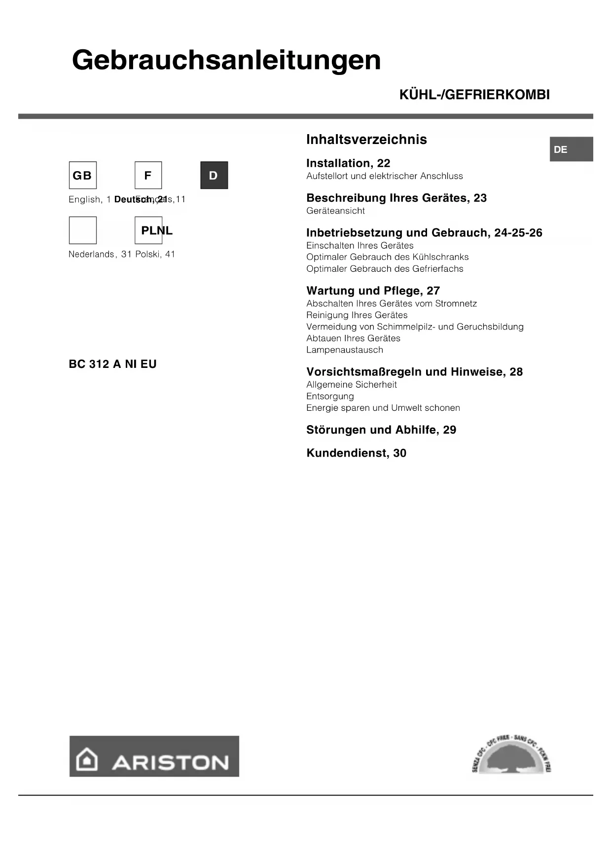 Laden Sie die Anleitung für Ihr Kühlschrank kostenlos im PDF-Format! Finden Sie Ihr Handbuch BC 312 ANI - HOTPOINT ARISTON und nehmen Sie Ihr elektronisches Gerät wieder in die Hand. Auf dieser Seite sind alle Dokumente veröffentlicht, die für die Verwendung Ihres Geräts notwendig sind. BC 312 ANI von der Marke HOTPOINT ARISTON.