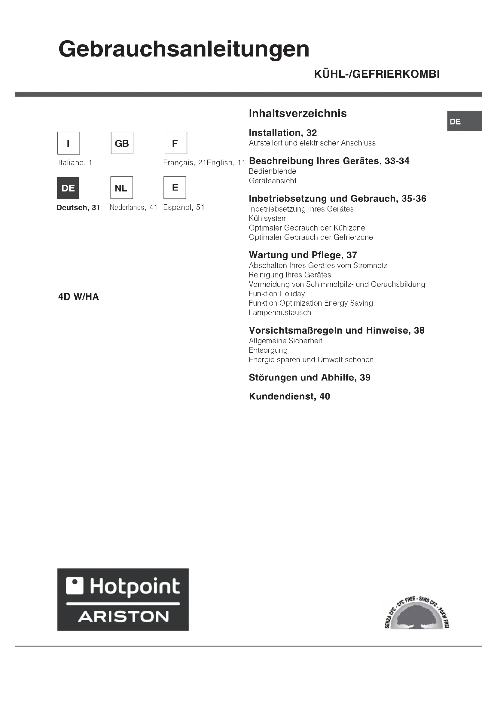 4DW HA - Kühlschrank HOTPOINT ARISTON - Kostenlose Bedienungsanleitung