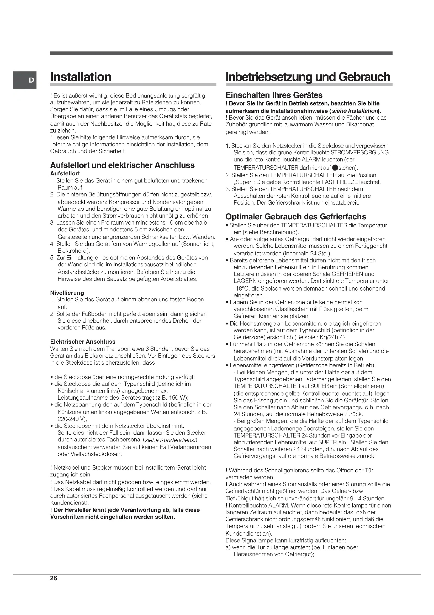 ! Bevor Sie das Gerät anschließen, müssen die Fächer und dasZubehör gründlich mit lauwarmem Wasser und Bikarbonatgereinigt werden.1. Stecken Sie den Netzstecker in die Steckdose und vergewissernSie sich, dass die grüne Kontrollleuchte STROMVERSORGUNGund die rote Kontrollleuchte ALARM leuchten (derTEMPERATURSCHALTER darf nicht auf stehen).2. Stellen Sie den TEMPERATURSCHALTER auf die Position„Super”: Die gelbe Kontrollleuchte FAST FREEZE leuchtet.3. Stellen Sie den TEMPERATURSCHALTER nach demAusschalten der roten Kontrollleuchte auf eine mittlerePosition. Der Gefrierschrank ist nun einsatzbereit. Optimaler Gebrauch des Gefrierfachs