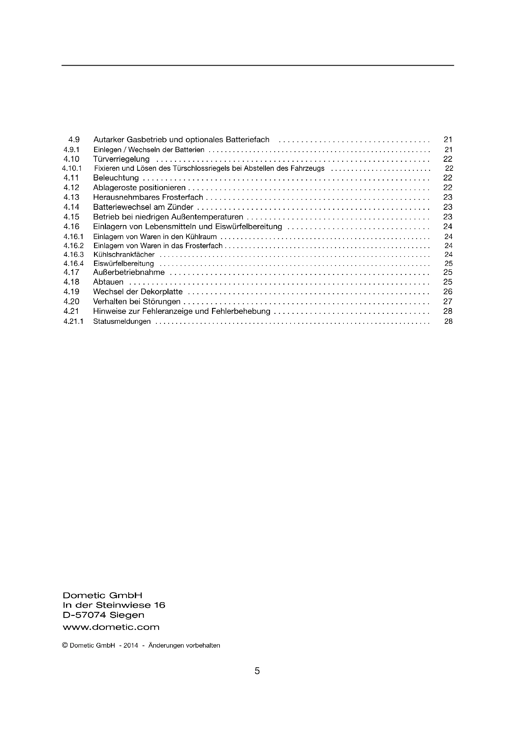 - 4.21.1 Statusmeldungen © Dometic GmbH - 2014 - Änderungen vorbehalten Dometic GmbH In der Steinwiese 16 D-57074 Siegen www.dometic.com 289 0317-00_DE_RMx8xxx-Bedienung_N4_Layout 1 10.12.2014 11:49 Seite 56 Allgemeines p. 28