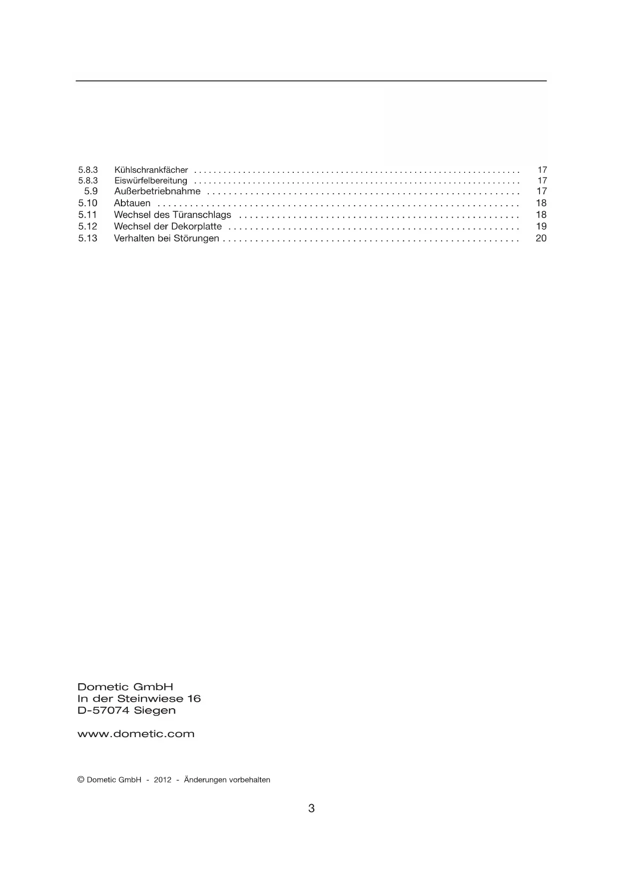 Die Angaben, Texte und Abbildungen in dieser Anleitung sind urheberrechtlich geschützt und unterliegen den gewerblichen Schutzrechten. Kein Teil dieser Anleitung darf ohne die schrift- liche Genehmigung der Dometic GmbH, Siegen, reproduziert, kopiert oder sonstwie verwendet werden.