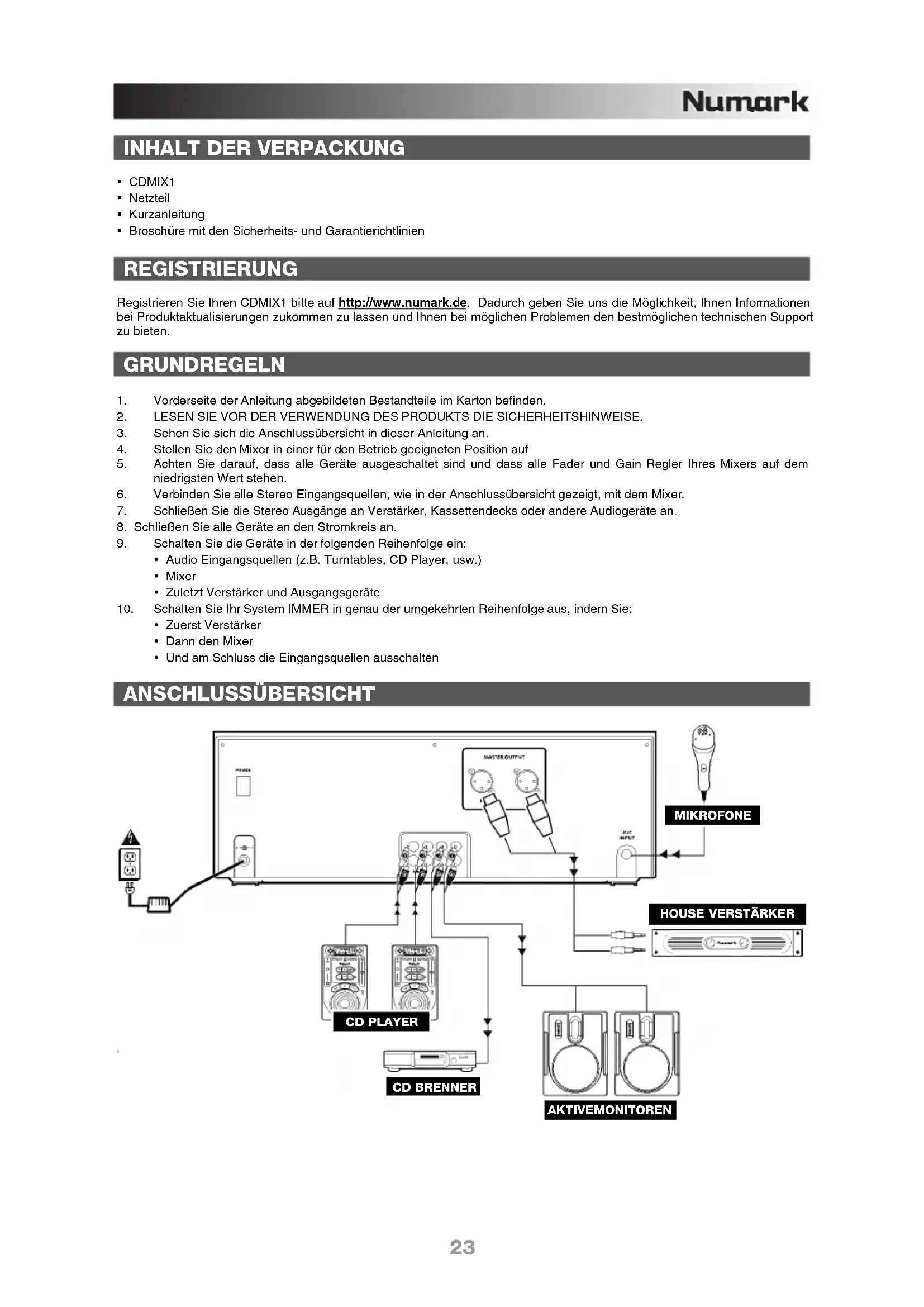 CDMIX1 Netzteil Kurzanleitung Broschüre mit den Sicherheits- und Garantierichtlinien REGISTRIERUNG Registrieren Sie Ihren CDMIX1 bitte auf http://www.numark.de. Dadurch geben Sie uns die Möglichkeit, Ihnen Informationen bei Produktaktualisierungen zukommen zu lassen und Ihnen bei möglichen Problemen den bestmöglichen technischen Support zu bieten. GRUNDREGELN