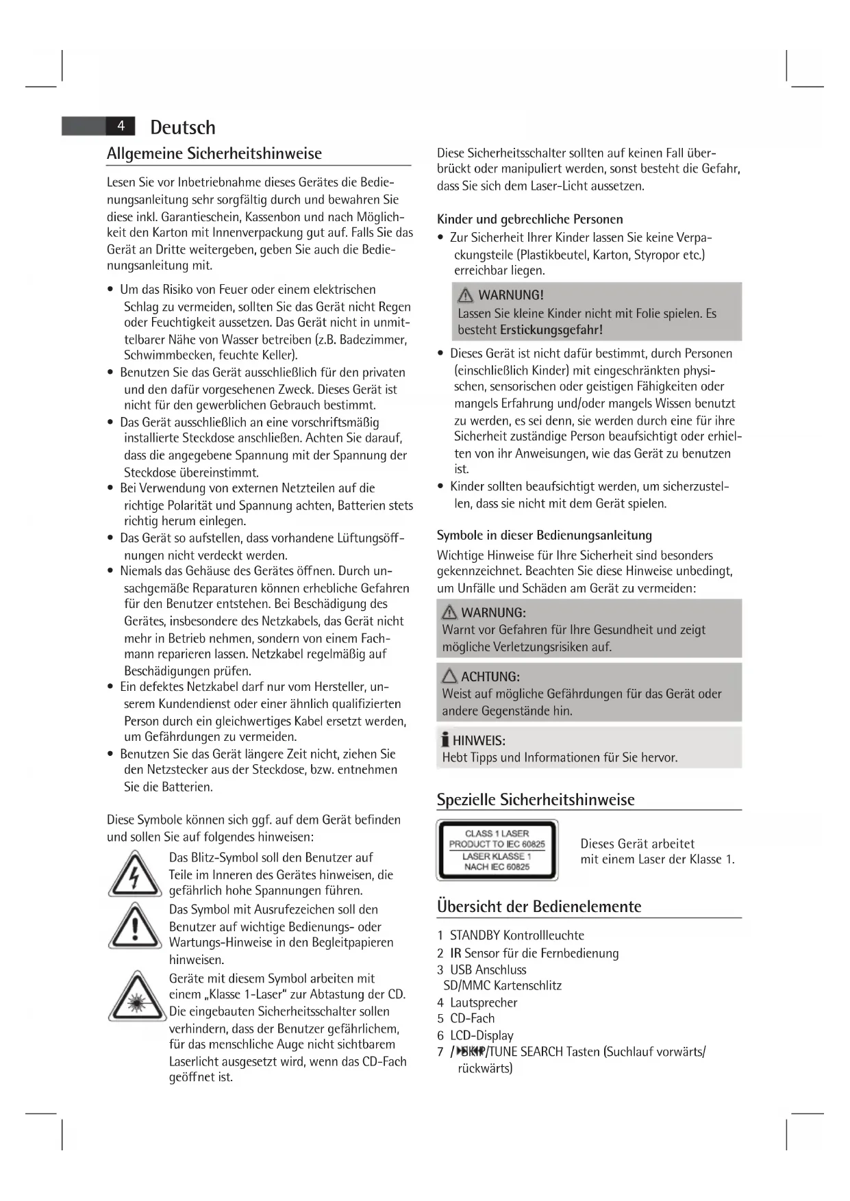 - Kinder sollten beaufsichtigt werden, um sicherzustel- len, dass sie nicht mit dem Gerät spielen. Symbole in dieser Bedienungsanleitung Wichtige Hinweise für Ihre Sicherheit sind besonders gekennzeichnet. Beachten Sie diese Hinweise unbedingt, um Unfälle und Schäden am Gerät zu vermeiden: WARNUNG: Warnt vor Gefahren für Ihre Gesundheit und zeigt mögliche Verletzungsrisiken auf. ACHTUNG: Weist auf mögliche Gefährdungen für das Gerät oder andere Gegenstände hin. HINWEIS: Hebt Tipps und Informationen für Sie hervor. Spezielle Sicherheitshinweise Dieses Gerät arbeitet mit einem Laser der Klasse 1. Übersicht der Bedienelemente 1 STANDBY Kontrollleuchte 2 IR Sensor für die Fernbedienung 3 USB Anschluss SD/MMC Kartenschlitz 4 Lautsprecher 5 CD-Fach 6 LCD-Display 7 / SKIP/TUNE SEARCH Tasten (Suchlauf vorwärts/ rückwärts)5 Deutsch 8 /STOP/MENU Taste 9 PLAY/PAUSE/ENTER Taste (Wiedergabe/Pause/ Bestätigen)